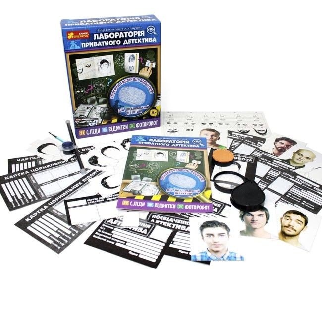 Комплектація: Чорнильна подушечка, картка для збирання латентних відбитків, картка латентних відбитків, картка чорнильних відбитків, чорнило, капсула з порошком графіту, пензлик, прозора плівка для зняття відбитків, посвідчення приватного детектива, лупа, світлини "злочинців", заготовки із зображенням губ, заготовки із зображенням борід та вусів, папка для створення фоторобота, заготовка форми обличчя, заготовки із зображенням очей, заготовки із зображенням носів, довідник приватного детектива