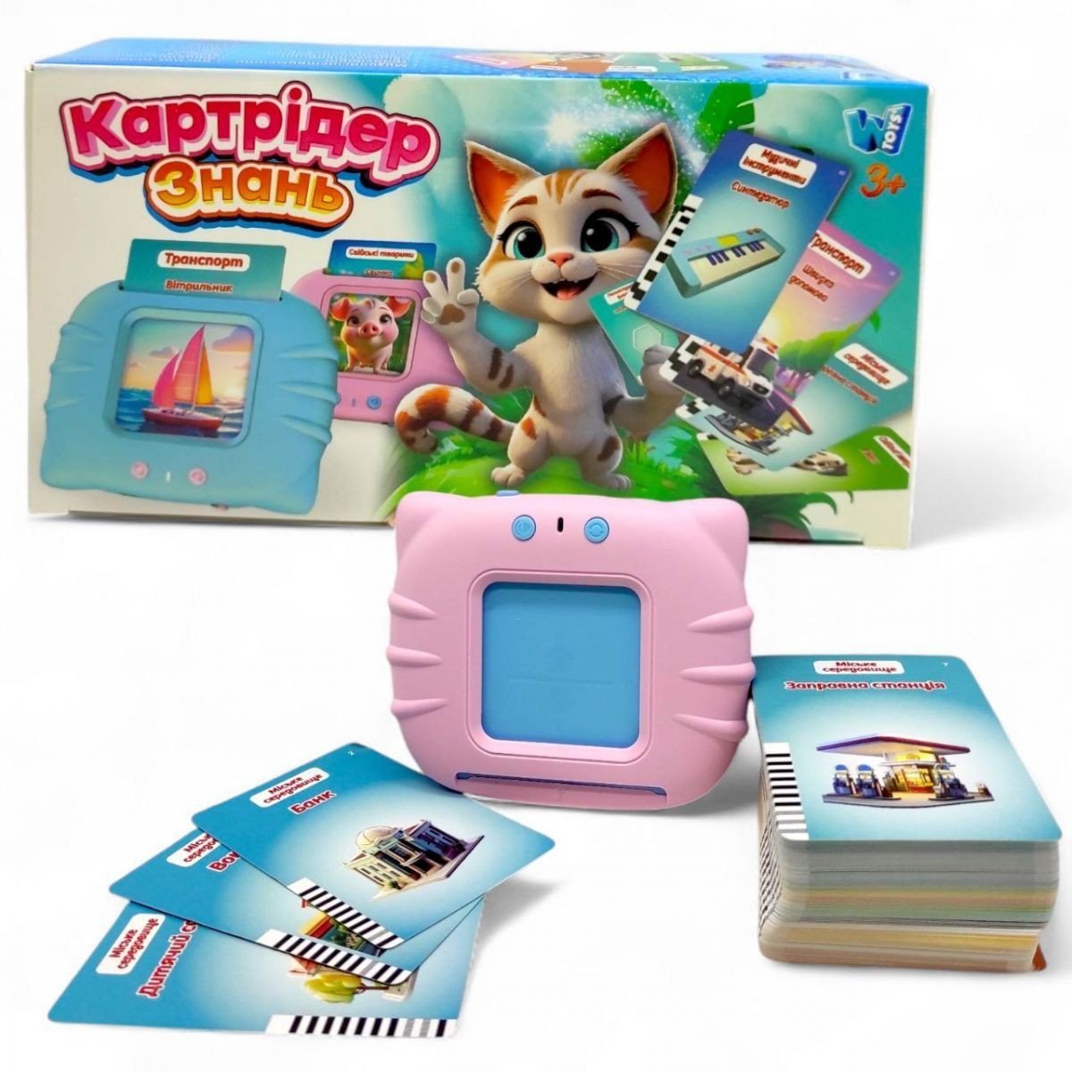 З цим картридером отримувати знання легко та цікаво! Варто лише вставити в пристрій навчальну картку, як вона оживе! Інтерактивна іграшка відтворить веселу пісеньку, прочитає вірш або озвучить цікавий факт. А ще - допоможе швидко опанувати абетку. Кожна картка - це окрема подорож у світ знань: від транспорту та міського середовища до природи з її чудернацькими тваринами. Компактний розмір картридера 10,5х1,5х9 см, дозволяє брати його із собою на прогулянку або в дорогу. Має зручне регулювання гучності та працює від вбудованого акумулятора (USB-кабель для зарядки входить у комплект). У наборі є 112 карток із 224 зображеннями, кожна з яких озвучена українською мовою. Дитина зможе не лише розглядати картки, а й слухати вірші, казки та пісеньки, що робить навчання більш цікавим та різноманітним. Матеріали якісні й безпечні, а яскравий дизайн неодмінно зацікавить малюка.Особливу увагу привертають 18 тематичних категорій, серед яких: музичні інструменти, транспорт, свійські тварини, геометричні форми, міське середовище, абетка, побутові прилади, цифри, членистоногі, космос (планети), фрукти, морські жителі, професії, овочі, гардероб, екзотичні тварини, кольори та птахи.