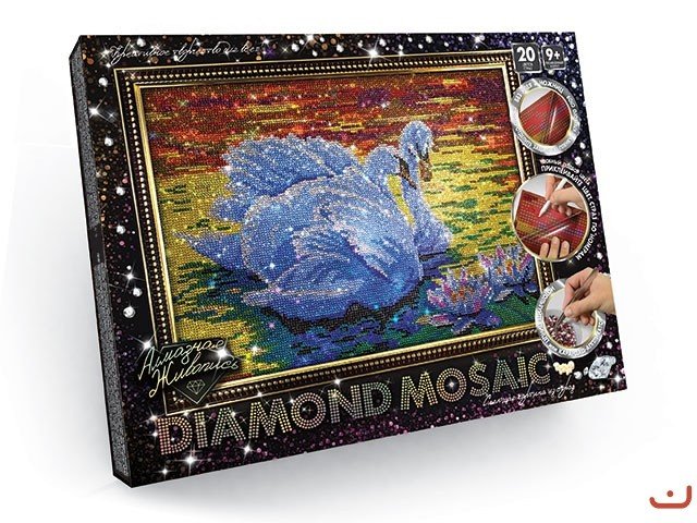 Набір креативної творчості "Алмазна живопис DIAMOND MOSAIC". На заготівлю завдано липкий шар, який дозволить без клею закріпити стрази, а зручна нумерація страз, робить роботу дуже простою і зрозумілою. Спеціальний олівець-аплікатор і пінцет, для захоплення і розстановки страз, допоможуть з легкістю розставити "алмази" по своїх місцях.