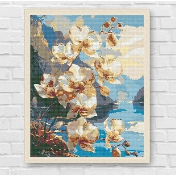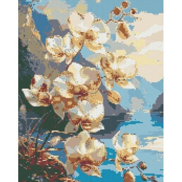 Опис Алмазна мозаїка "Квіти орхідеї біля гірської річки" 40х50 см
