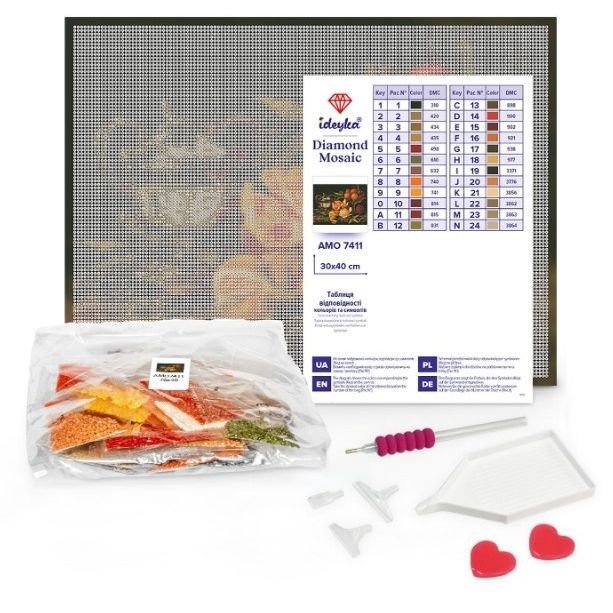 Викладення картин алмазною технікою є чудовим заняттям для зняття стресу, медитації та релаксу. Готові картини можуть прикрашати інтерʼєр. Виблискуючий шедевр створюється за допомогою маленьких різнокольорових кристалів, які один за одним слід приклеювати на заготовлений ескіз. У наборі: полотно з клейовим шаром на підрамнику, лоток для сортування страз, пінцет, стілус, липка маса для стілуса, різнокольорові стрази, схема. Розмір: 30х40 см.