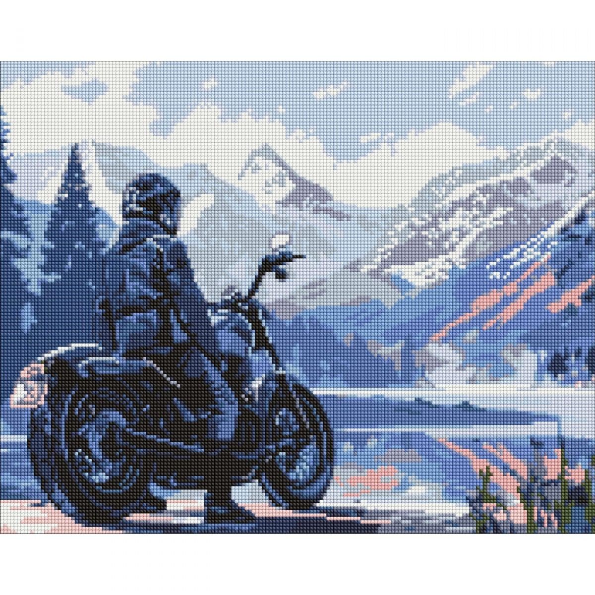 Опис Алмазна мозаїка "Мотоцикліст у горах" 50х40 см
