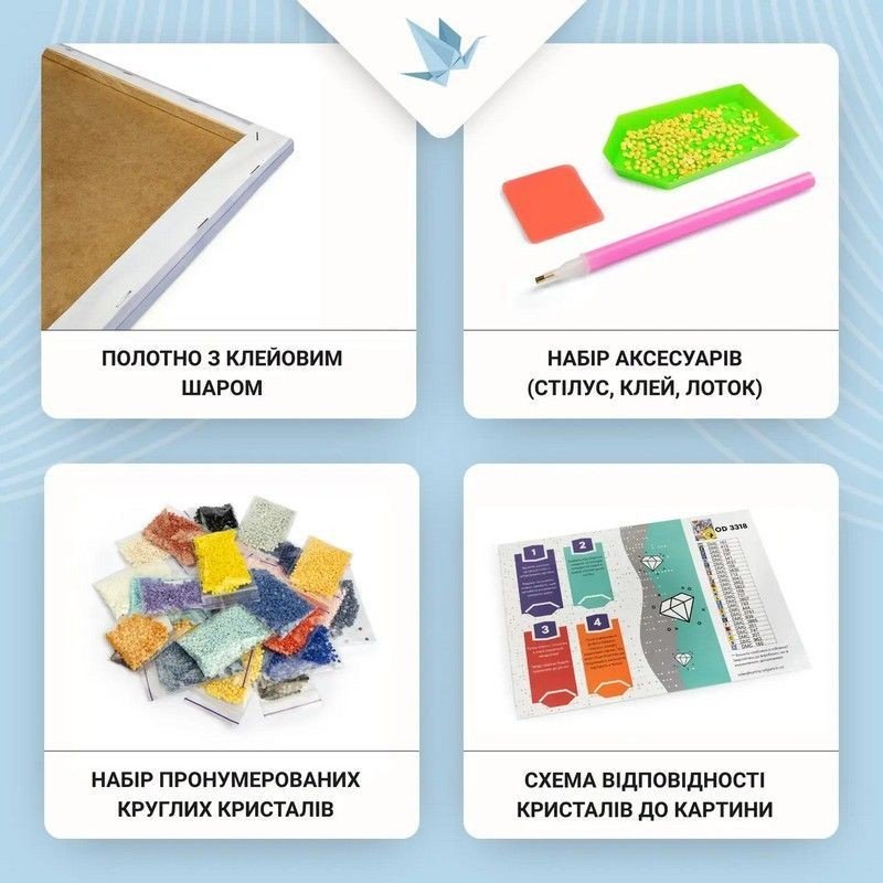 Бренд: Origami Упаковка: Плівка Колір: Різнобарв'я Габарити в упаковці: 2 x 40 x 50 см Габарити без упаковки: 2 x 40 x 50 см Країна виробник: Україна Матеріал: Комбінований Комплектація: Полотно, ручка-стилус, гель-клей, акрилові стрази згідно з комплектацією набору