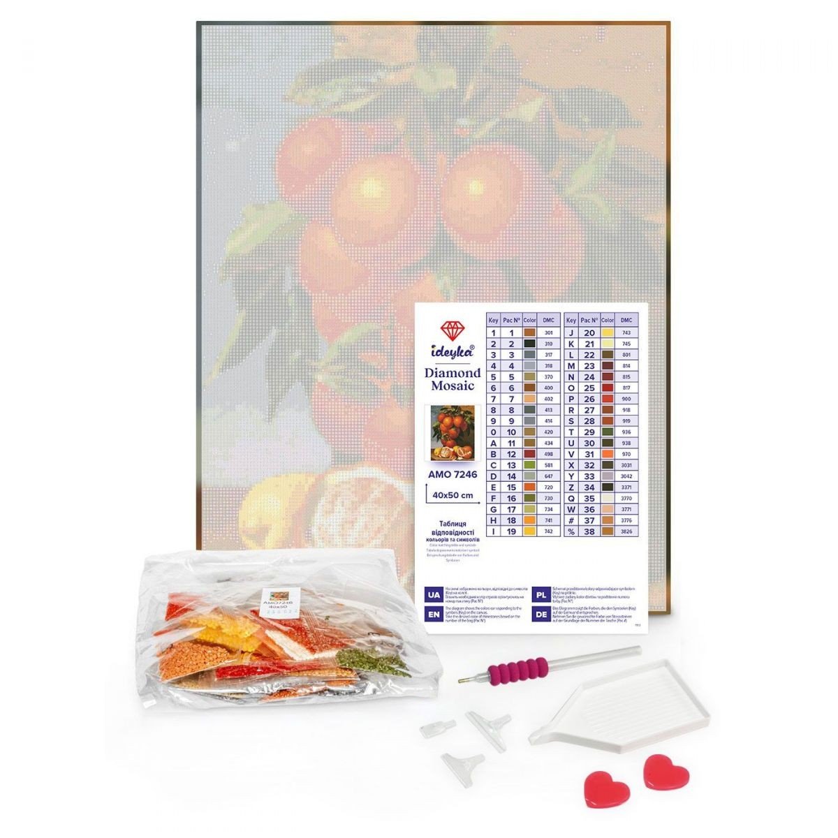 Викладення картин алмазною технікою є чудовим заняттям для зняття стресу, медитації та релаксу. Готові картини можуть прикрашати інтерʼєр. Виблискуючий шедевр створюється за допомогою маленьких різнокольорових кристалів, які один за одним слід приклеювати на заготовлений ескіз. У наборі: полотно з клейовим шаром на підрамнику, лоток для сортування страз, пінцет, стілус, липка маса для стілуса, різнокольорові стрази, схема. Розмір: 40х50 см.