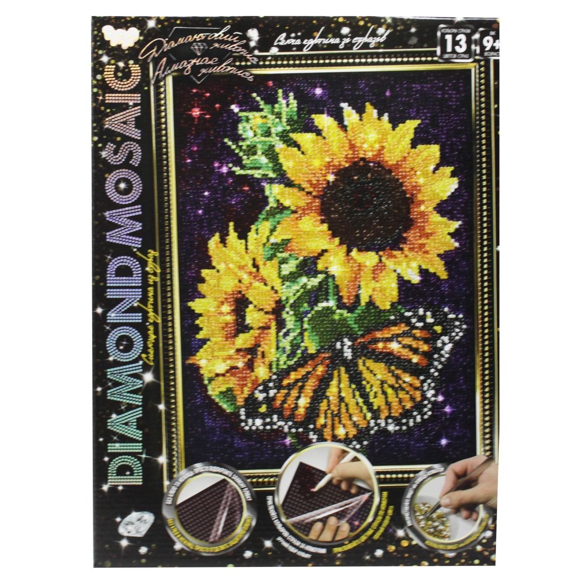 Набір творчої творчості "Алмазний живопис DIAMOND MOSAIC". На заготівлю нанесений липкий шар, який дозволить без клею закріпити стрази, а зручна нумерація страз робить роботу дуже простою та зрозумілою. Спеціальний олівець-аплікатор і пінцет, для захоплення та розміщення страз, допоможуть з легкістю розставити "алмази" по своїх місцях. Розмір картинки 30х20 см. Для дітей віком від 9-ти років.