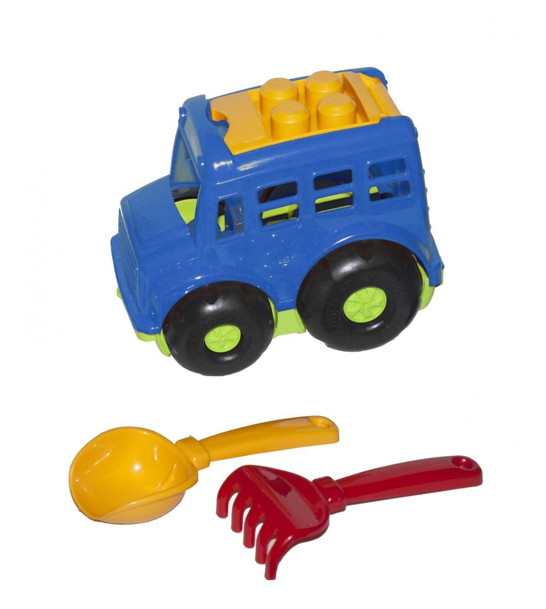 Автобус "Бусик №1" + лопатка і грабельки. Розмір лопатки - 16 см, граблі - 15 см. З цим набором дитина зможе грати як вдома, так і на вулиці.