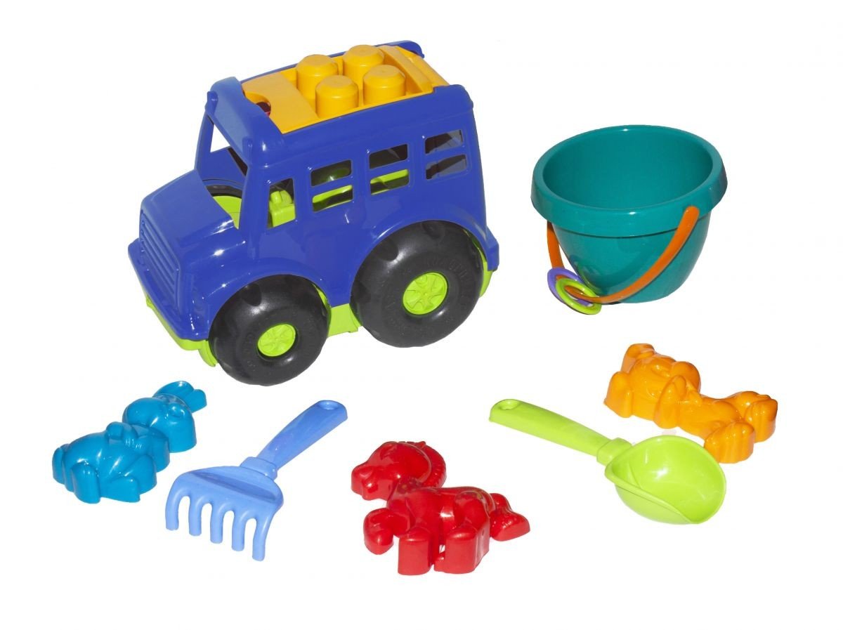 Машинка автобус "Бусик" №3 з пісочним набором. Пісочний набір складається з: (відерце, лопатка, грабельки, 3 пасочки).