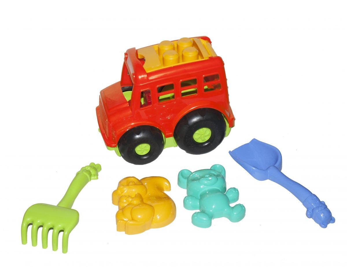 Автобус бусик з пісочним набором. Дві пасочки в формі тварин, лопатка і грабельки.