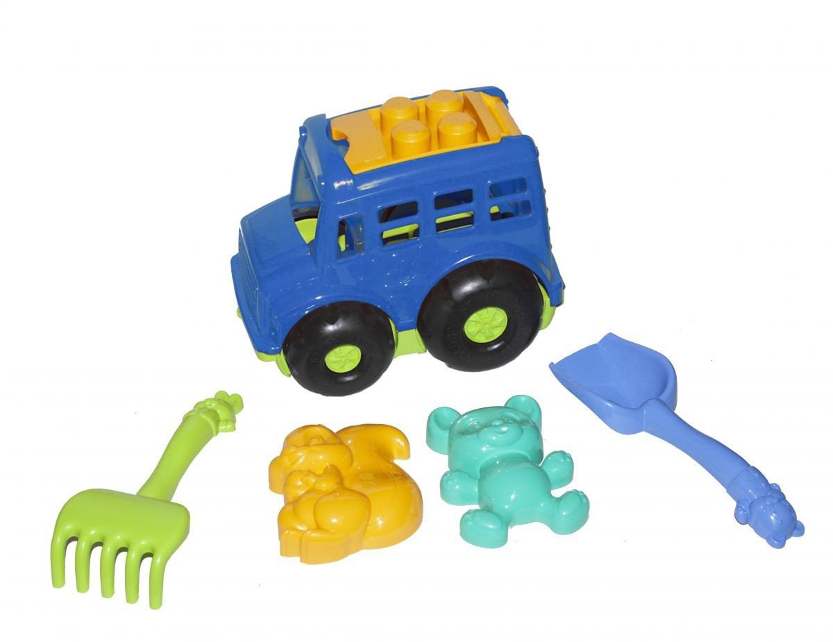 Машинка (автобус) бусик з пісочним набором. Дві пасочки в формі тварин, лопатка і грабельки.