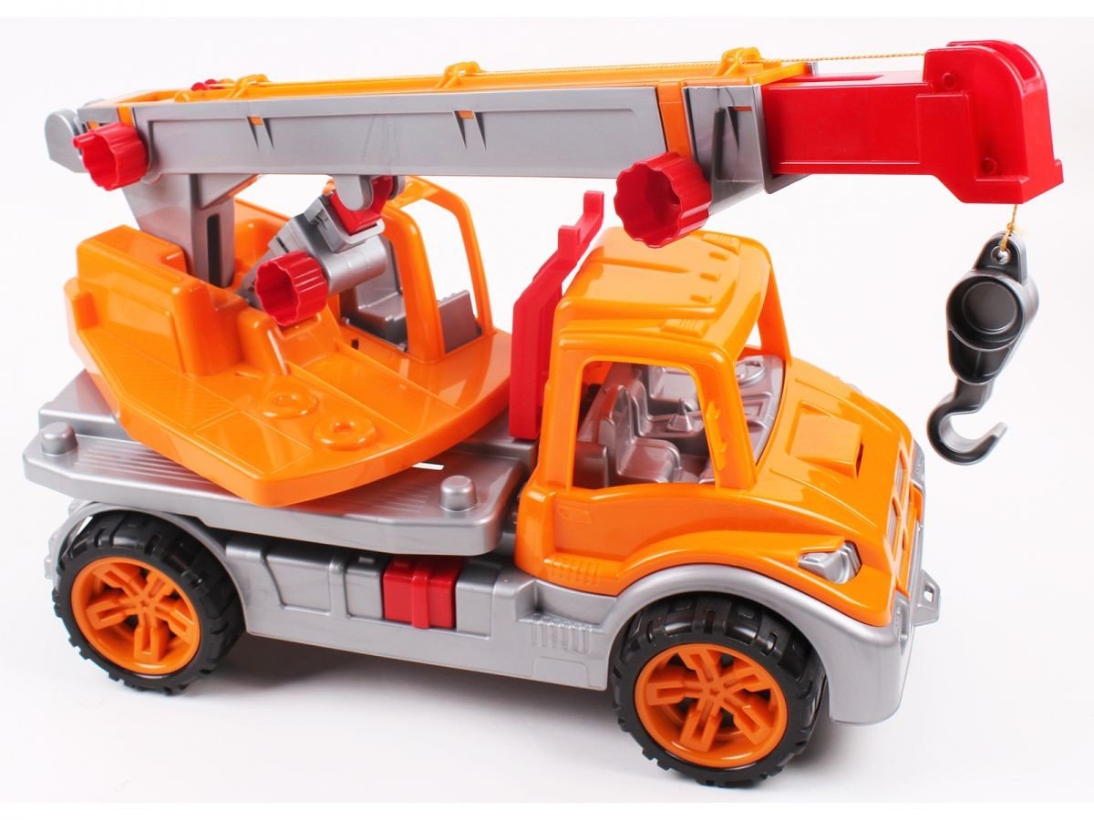 Пластиковий помаранчевий автокран. Має що повертається майданчик з висувною стрілою, яка може підніматися.