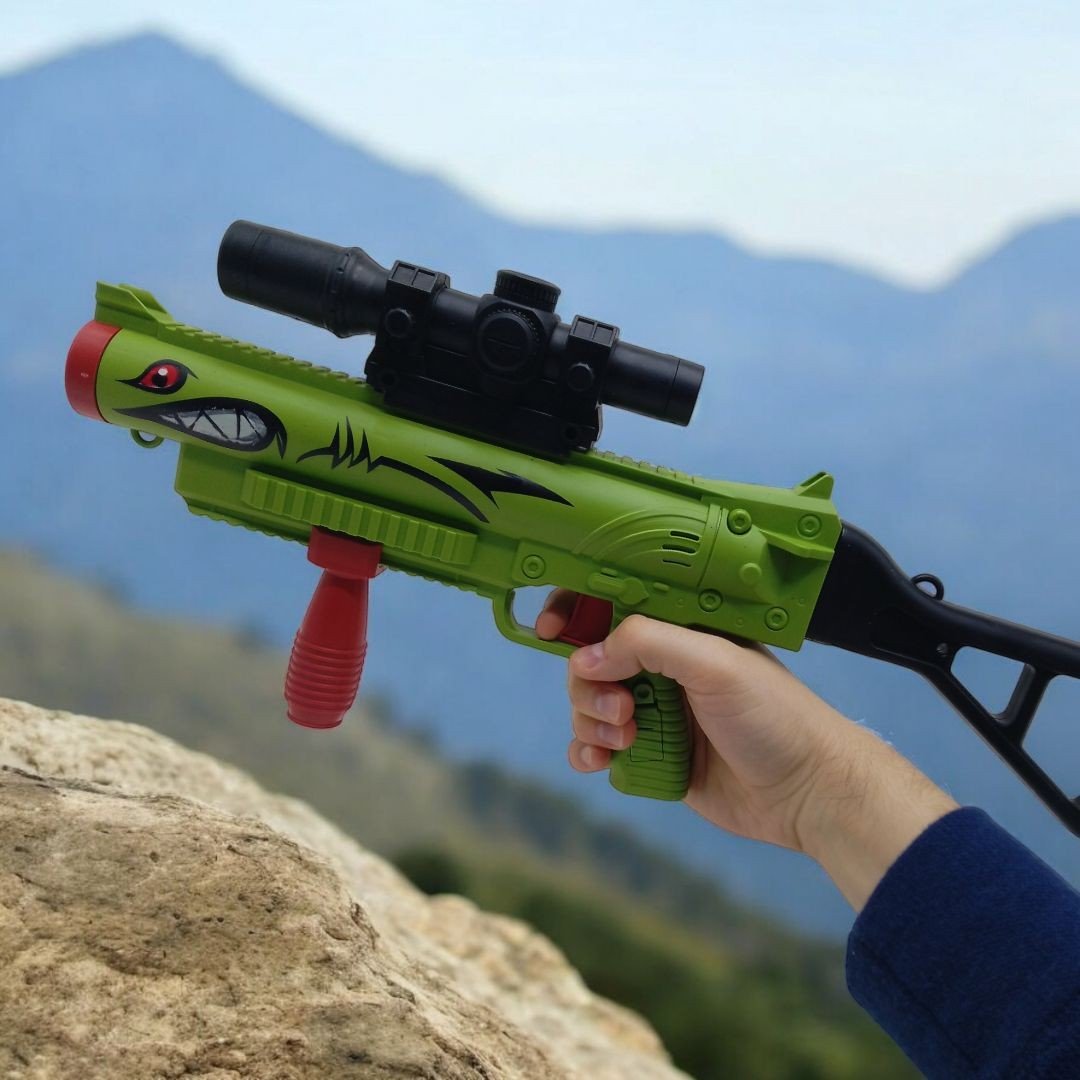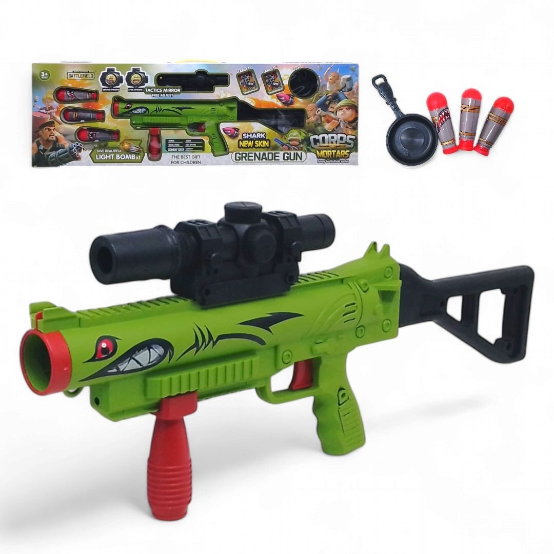Бренд: MIC Упаковка: Коробка Колір: Зелений Вага з упаковкою: 530 г Габарити в упаковці: 26 x 80 x 5.5 см Країна виробник: Китай Матеріал: Пластик Комплектація: Автомат-міномет, 3 снаряди, сковорода, 2 паперові мішені