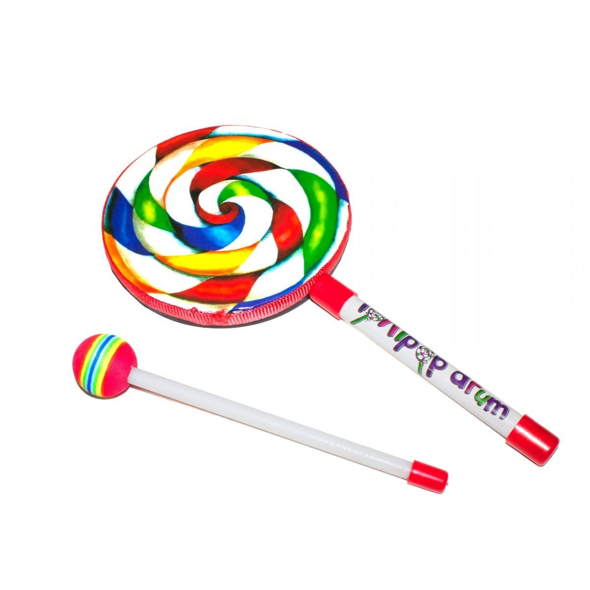 Барабан з ручкою "Льодяник". Барабанчик з ручкою і паличкою (молоточком) з мʼяким наконечником. Діаметр - 15,5 см.