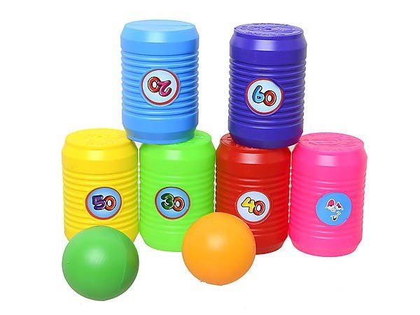 У наборі: 6 пластикових діжок для боулінгу, 2 кульки в сітці. Висота діжок: 10 см. Діаметр: 6 см. Всі кеглі в наборі пронумеровані, їх можна розставити в математичному або в довільному порядку. Виграє той, хто за найменшу кількість разів зіб'є більше очок. Збиті за один удар кеглі підсумовуються.