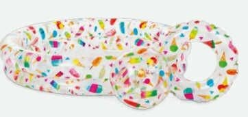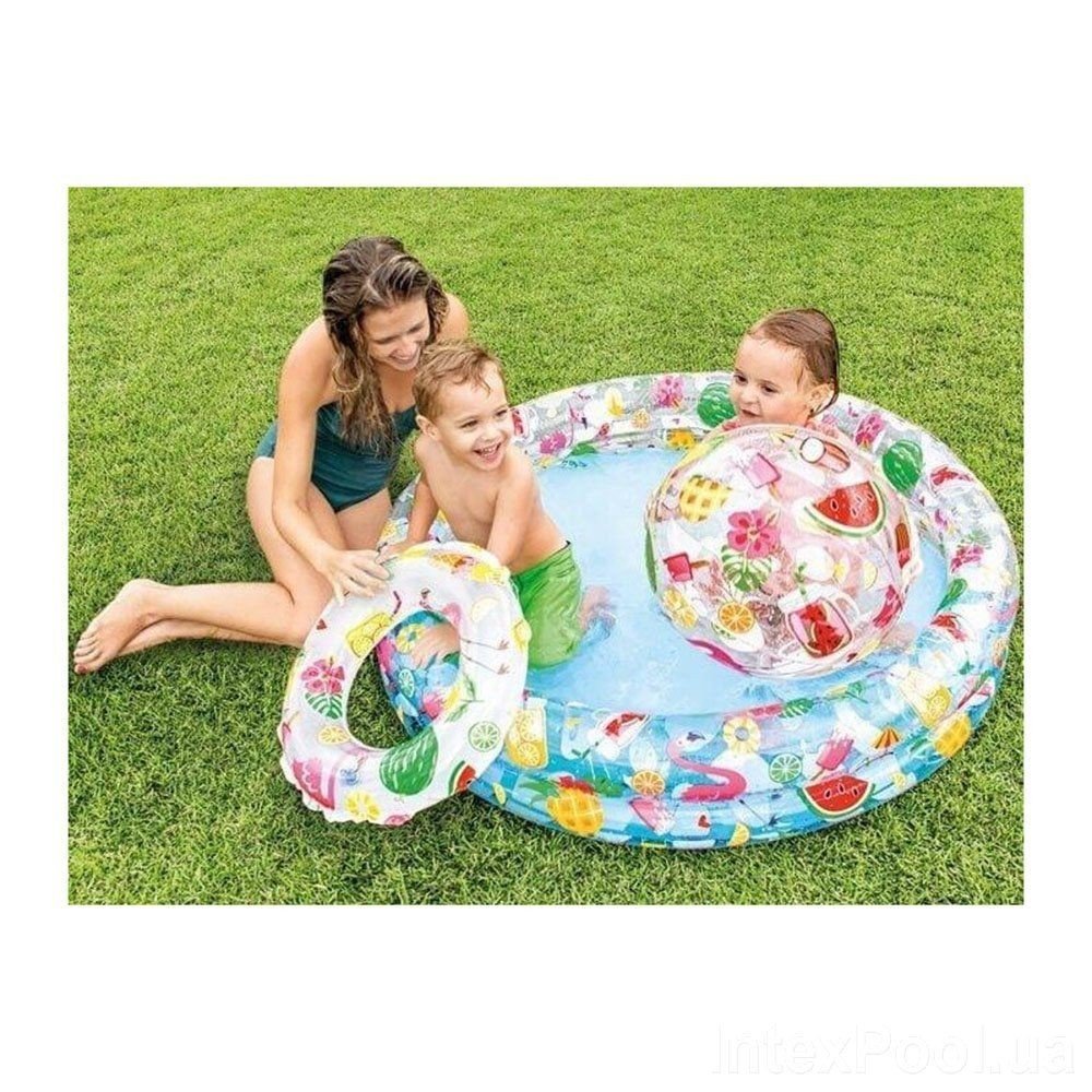 Бренд: Intex Колір: Різнобарв'я Габарити в упаковці: 36 x 31 x 5 см Країна виробник: Україна Матеріал: Комбінований Комплектація: Надувний басейн, надувний м'яч, надувний круг