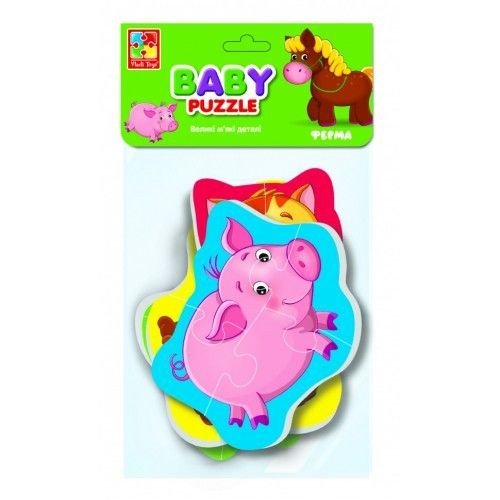 Бебі пазли "Ферма" хороший варіант пазлів для малюків. Розвивають дрібну моторику, формують знання про жівотних.Часті пазлів досить великого розміру. В комплекті 4 зображення тварин.