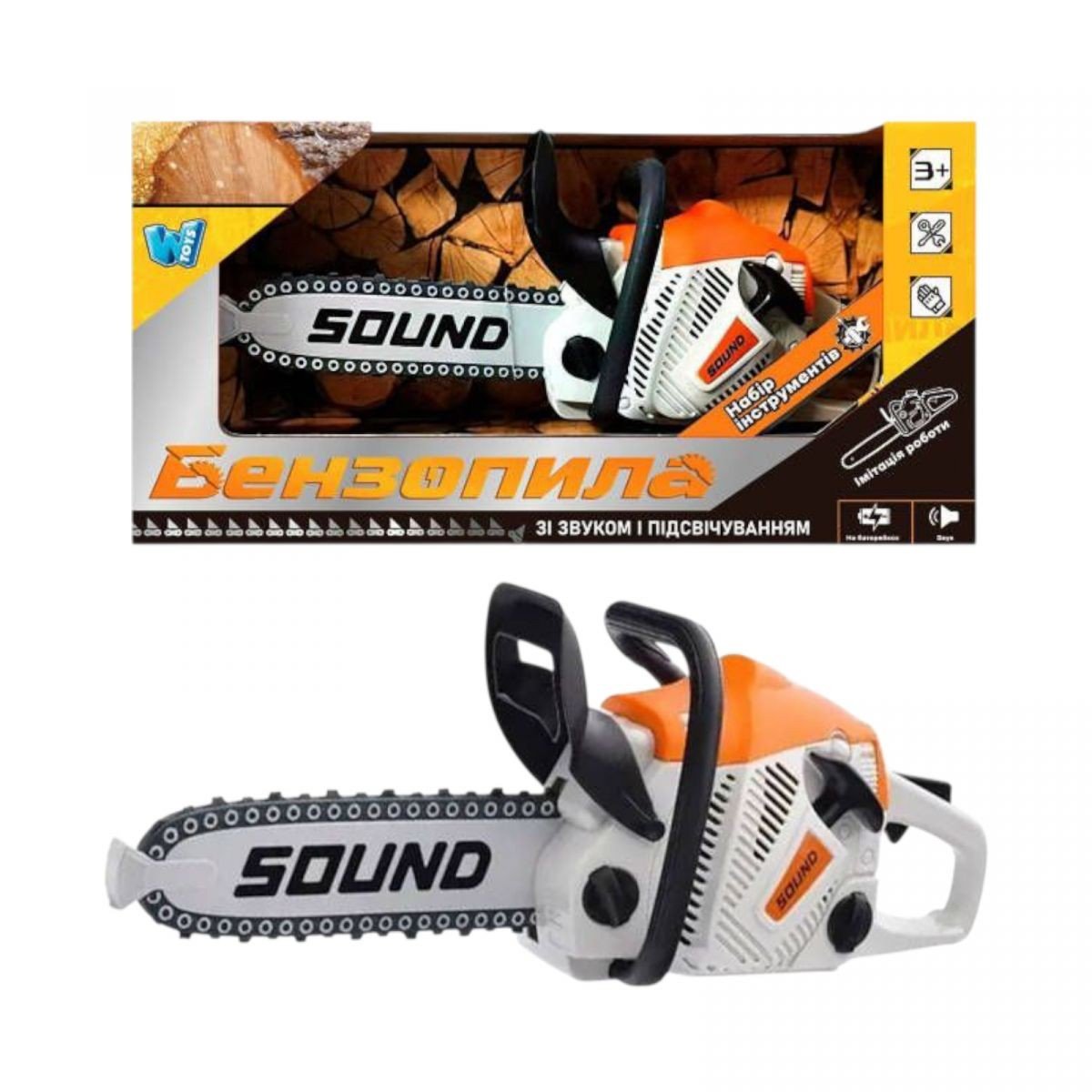 Опис Бензопила звук, ланцюг рухається, на батарейках, в коробці