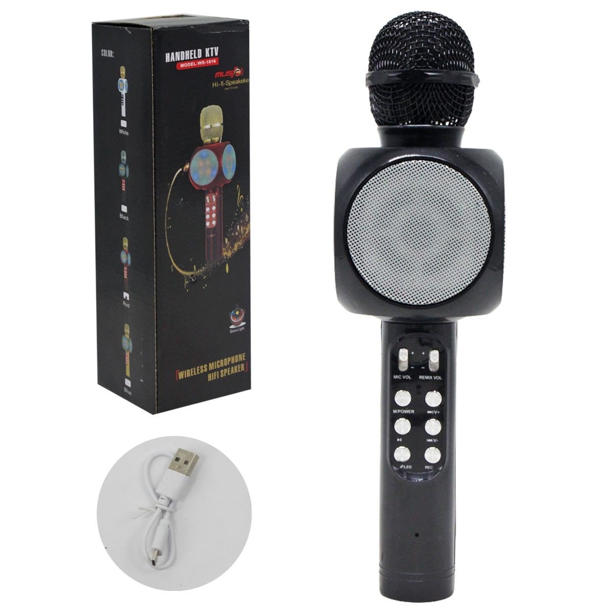 Бездротовий мікрофон-караоке. Підключається до смартфону за допомогою Bluetooth. Можна використовувати як звичайний мікрофон, так і портативну колонку. Програє музику зі смартфона та дозволяє співати під них, записуючи свої композиції (вбудований слот для картки пам'яті). Має роз'єм для підключення навушників. Можна увімкнути мікрофон з ефектом луни. Є різнобарвне яскраве підсвічування, яке при необхідності можна вимкнути.