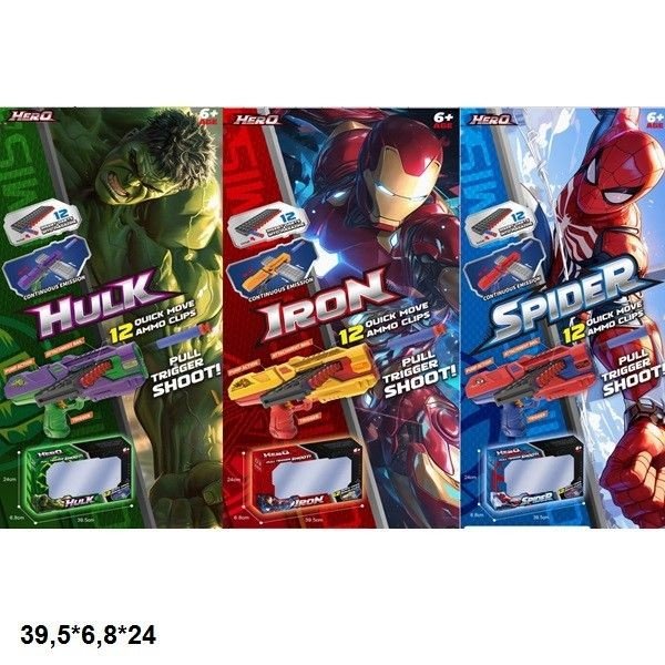 Ігровий набір із бластером, який стріляє поролоновими патронами. Виконаний у супергеройській тематиці, він обовʼязково приверне до себе увагу і радуватиме дитину. Для початку стрільби обойму з патронами потрібно встановити так, як це зображено на коробці. Розмір бластера - 28,5х16х4,5 см; довжина патрона з присоскою - 7 см. Виконано все з якісних та безпечних матеріалів та рекомендовано для дітей віком від 6 років.