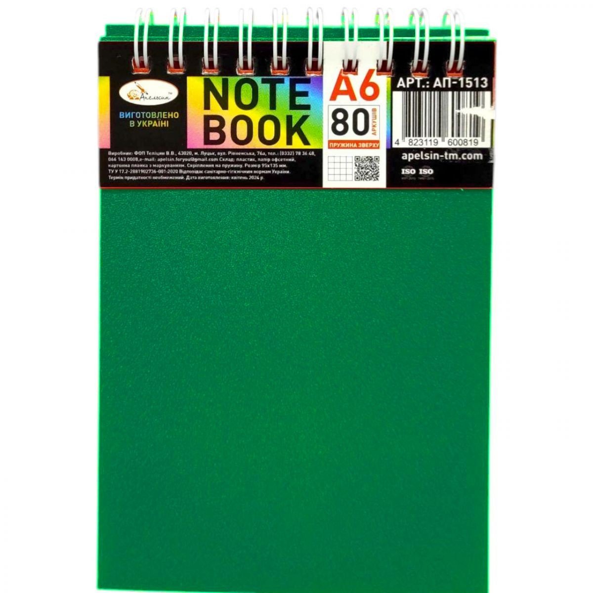 Опис Блокнот А6, 80 арк., пластик, пружина зверху (ЗЕЛЕНИЙ)