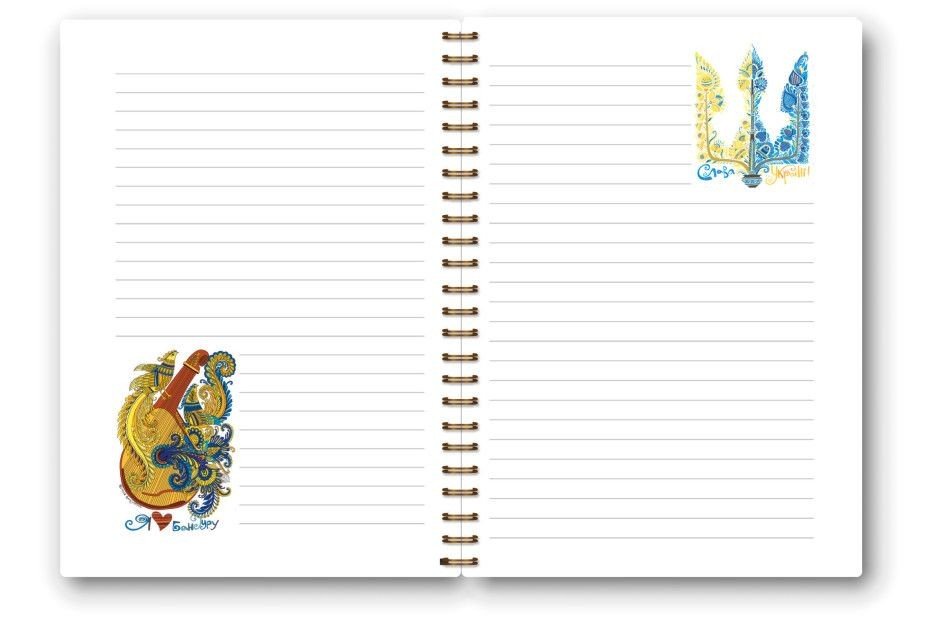 Подарунковий блокнот серії "З Україною в серці". 160 аркушів у лінію, папір високої якості. Авторська ілюстрація Олесі Вакуленко на обкладинці прикрашена золотим тисненням. Обкладинка виконана із щільного картону. Блокнот на металевій пружині збоку. Розмір блокнота – 15 х 21.5 см.