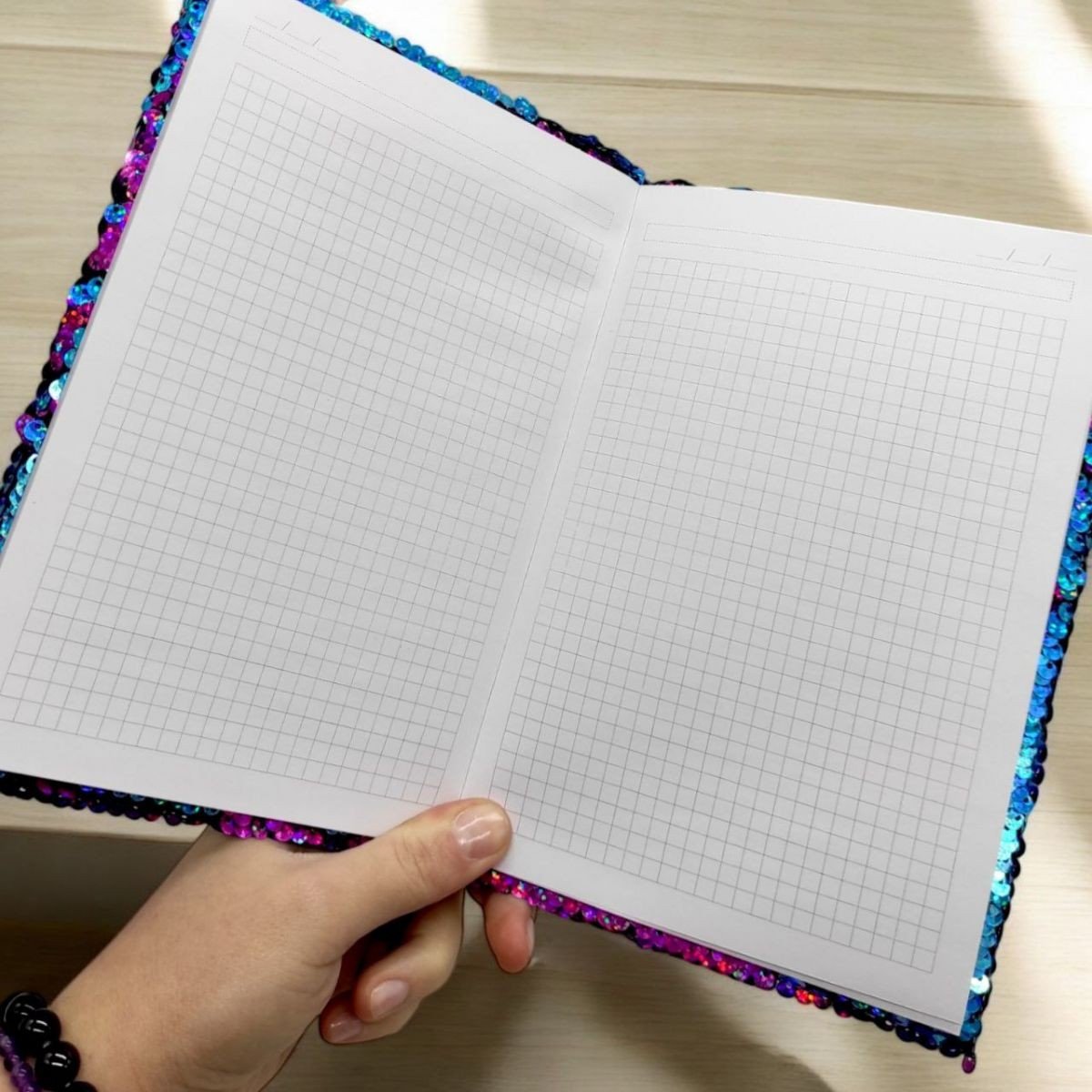 Блокнот формату А5 з 80 аркушами, покритий паєтками, що переливаються. Провівши рукою по поверхні, можна легко змінити колір паєток, створюючи незвичайні візерунки. Усередині аркуші в клітинку, що ідеально підходять для нотаток, замальовок або записів. Компактний розмір дозволяє брати блокнот із собою будь-куди.