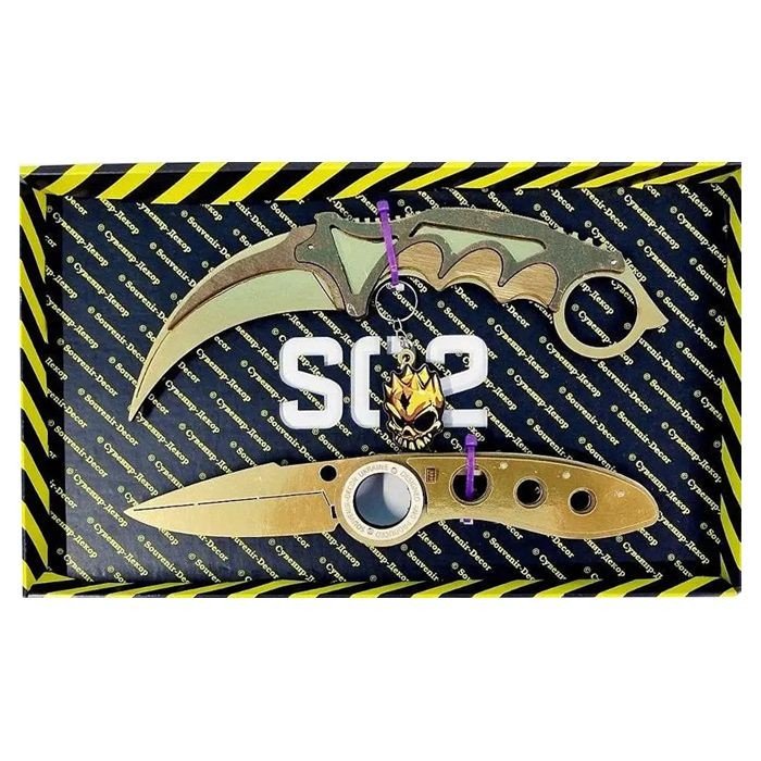 Набір сувенірних ножів - керамбіт та викидуха. Матеріал: фанера. Довжина ножа – 20 см. Чудовий подарунок-сувенір, у комплекті є дармовис. Ножі дерев'яні, якісні та міцні. Не заточені, гострі частини закруглені та зашліфовані, повністю безпечні. Для дітей віком від 6 років.