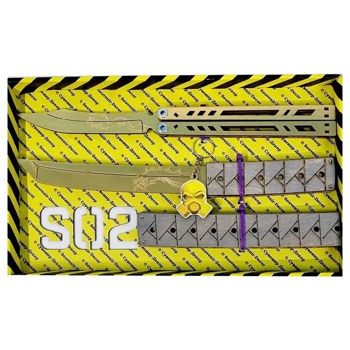 Набір сувенірних ножів - метелик і Tanto якудза. Матеріал: фанера. Довжина ножа – 26.5 см, та 28 см. Чудовий подарунок-сувенір, у комплекті є дармовис. Ножі дерев'яні, якісні та міцні. Не заточені, гострі частини закруглені та зашліфовані, повністю безпечні. Для дітей віком від 6 років.