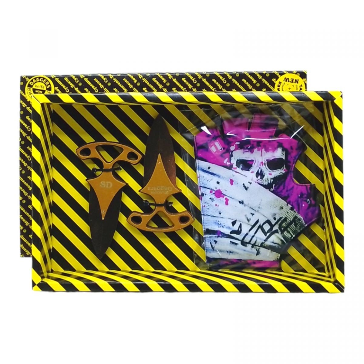 Набір із сувенірним ножем стане чудовим варіантом подарунка. Виріб виготовлений з фанери, добре відшліфований та профарбований. Довжина ножа складає 11,5 см. У комплекті також є тканинна перчатка (колір перчатки може відрізнятися від заявленого на фото). Укомплектовано все в гарний картонний шоубокс. Всі вироби набору повністю безпечні (не заточені, гострі частини закруглені та зашліфовані).