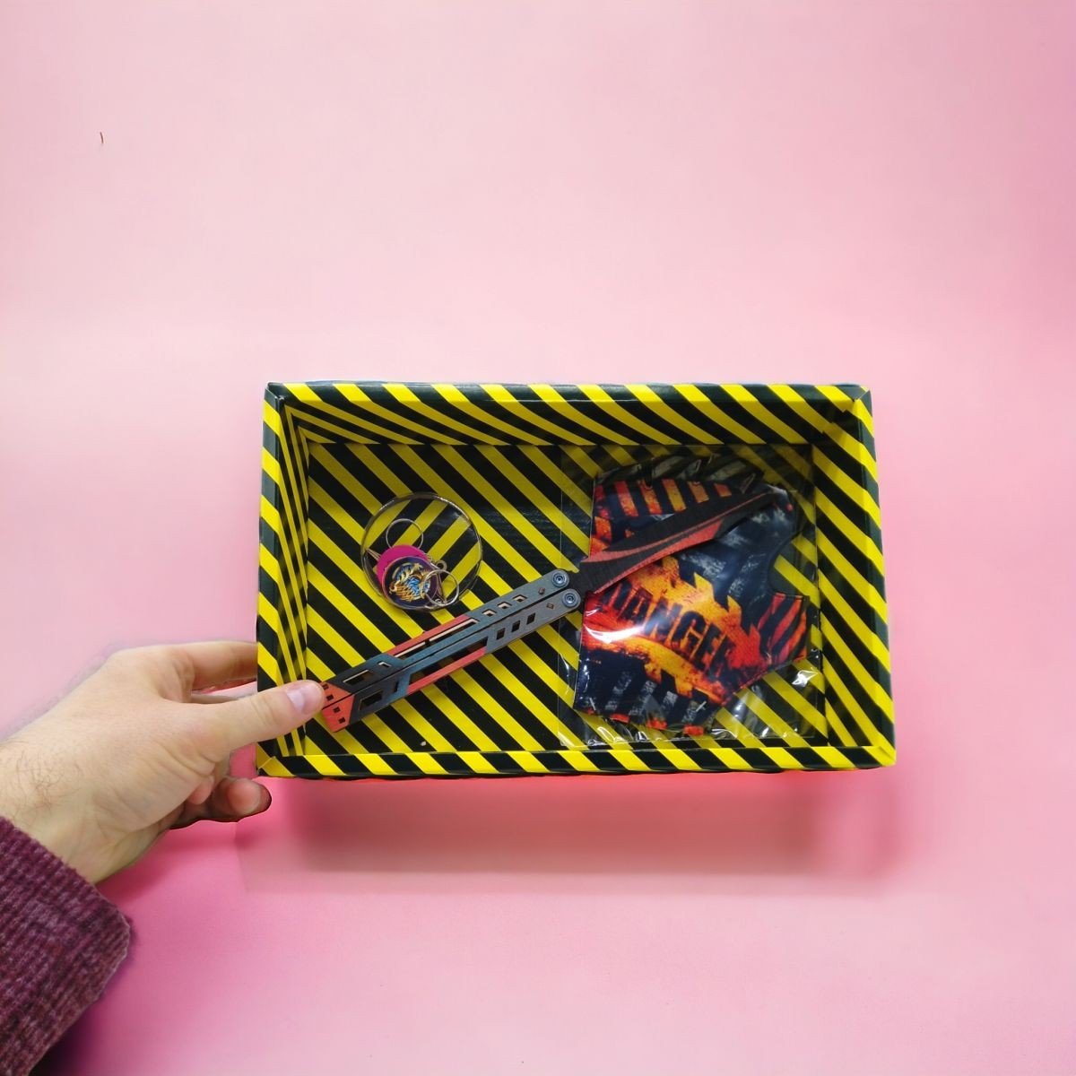 Набір із сувенірним ножем стане чудовим варіантом подарунка. Виріб виготовлений з фанери, добре відшліфований та профарбований. Довжина ножа складає 26,5 см. У комплекті також йде маленький деревʼяний брелок і тканинна перчатка (колір перчатки може відрізнятися від заявленого на фото). Укомплектовано все в гарний картонний шоубокс. Всі вироби набору повністю безпечні (не заточені, гострі частини закруглені та зашліфовані).