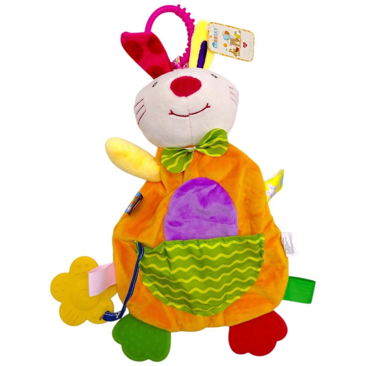 Брязкальце-комфортер створене для заспокоєння та забезпечення комфорту малюка з перших місяців життя. Іграшка має приємну на дотик текстильну частину у вигляді милої тваринки, яку зручно тримати маленькими ручками, обіймати та притискати під час відпочинку або сну. Гумовий прорізувач допомагає полегшити дискомфорт під час прорізування зубів, а брязкальце всередині м’яко привертає увагу дитини. На виробі є шелесткі частини та кільце для підвішування. Виготовлено з якісних і безпечних матеріалів.