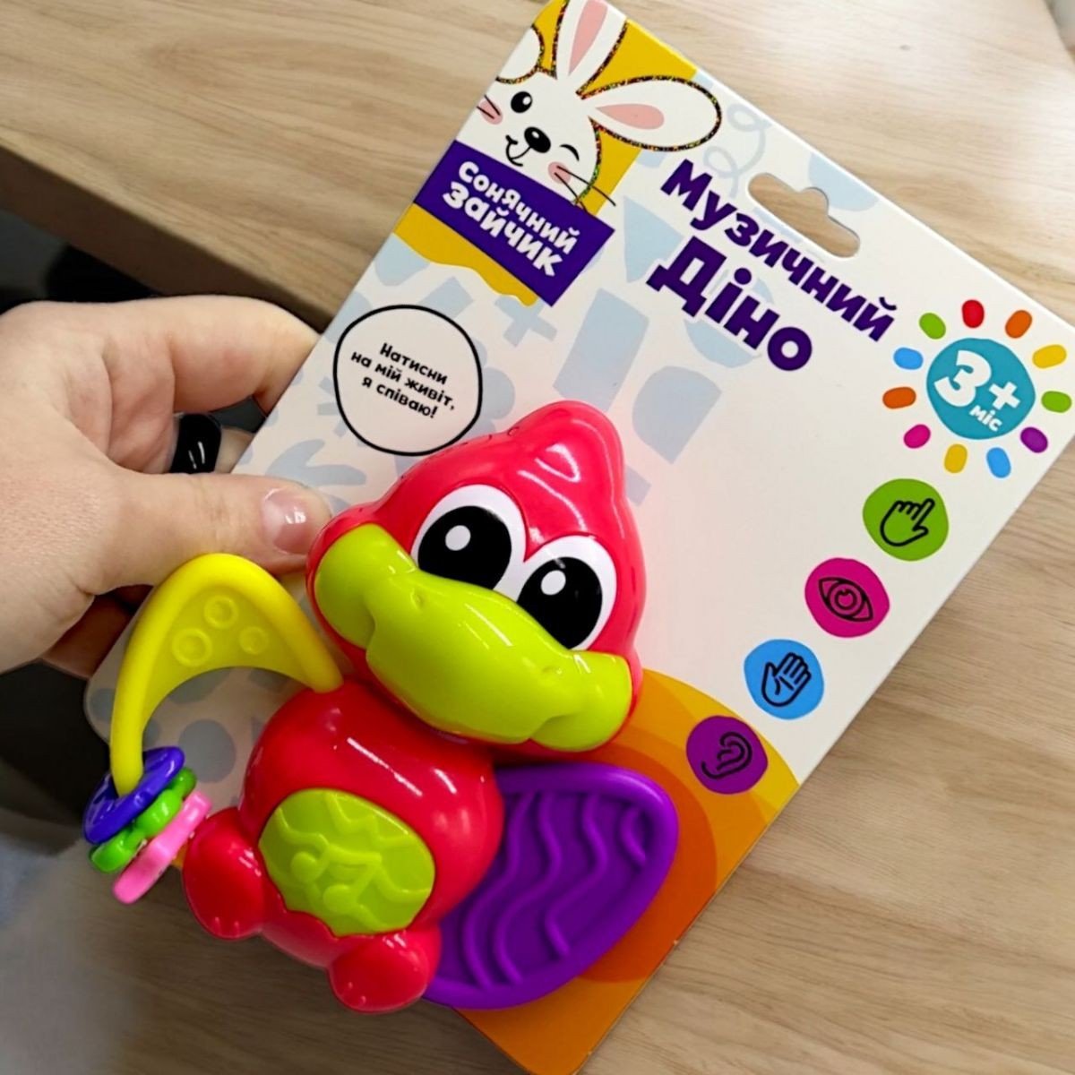 Музичний птерозавр грає 3 веселі пісеньки, чудові звуки та має сяючі вогники! Спробуй і ти! Голова повертатиметься на 360 градусів зі звуками клацання, мʼяке та фактурне крило можна використтовувати як прорізувач для зубів, різнокольорові кільця легко тримати і пересувати.