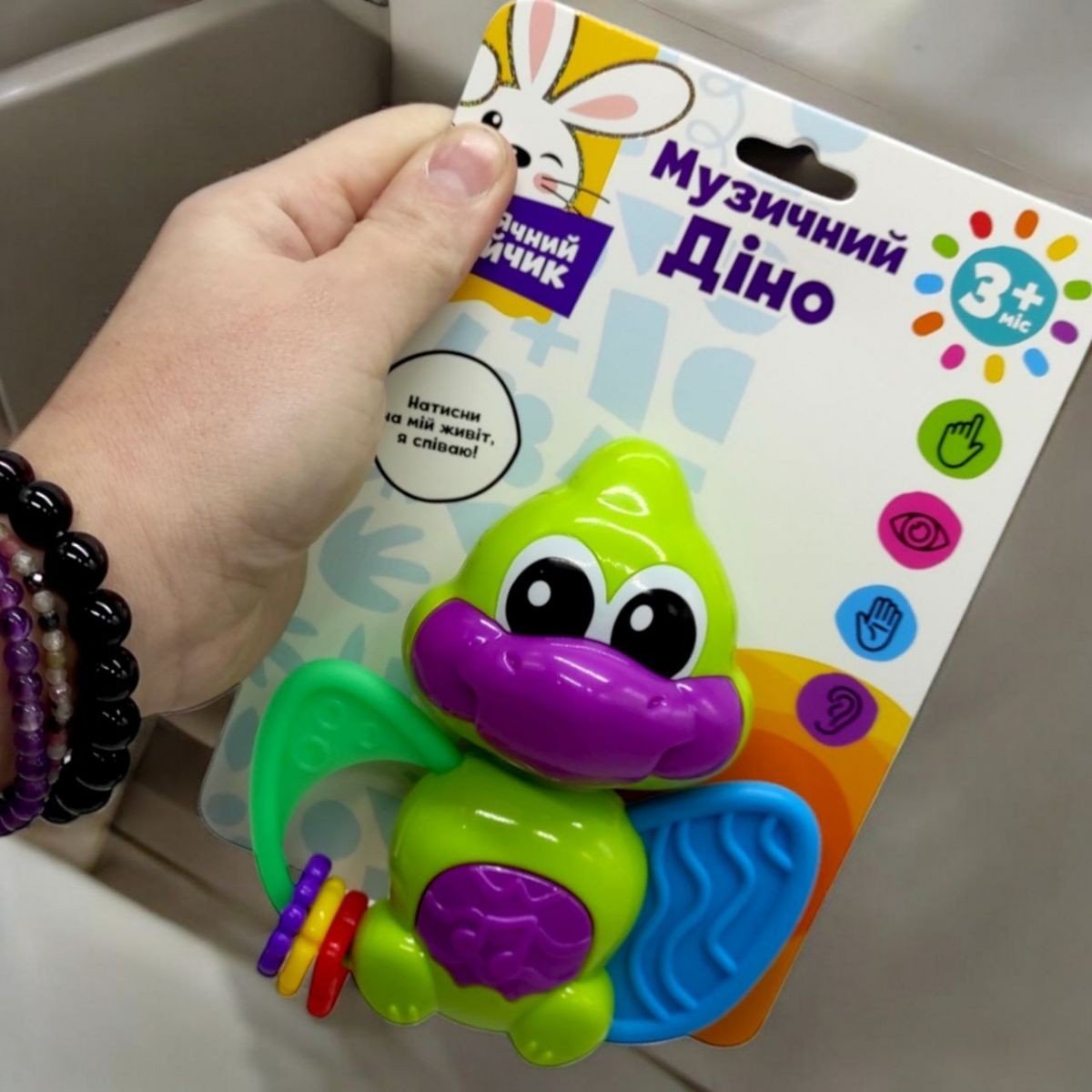 Музичний птерозавр грає 3 веселі пісеньки, чудові звуки та має сяючі вогники! Спробуй і ти! Голова повертатиметься на 360 градусів зі звуками клацання, мʼяке та фактурне крило можна використтовувати як прорізувач для зубів, різнокольорові кільця легко тримати і пересувати.