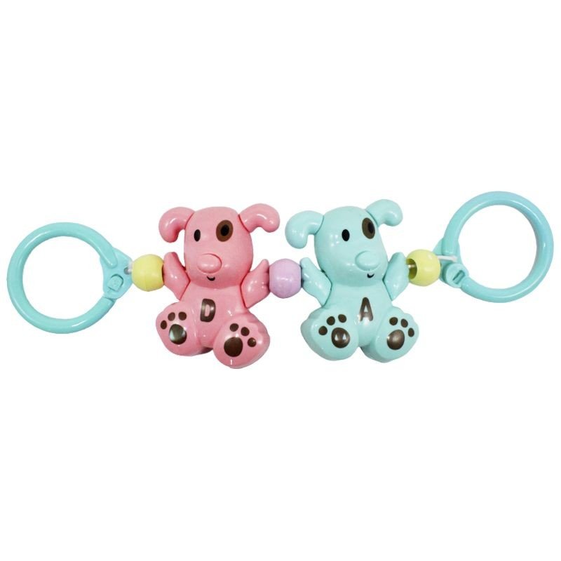 Яскраве брязкальце у вигляді двох милих собачок, які тримаються за ручки. Можна чіпляти на ліжечко або коляску за допомогою зручних універсальних кріплень. Має приємний, не дуже гучний звук. Виготовлена із якісного пластику. Розмір однієї собачки – 8х5х3 см. Довжина із кріпленнями – 27 см.