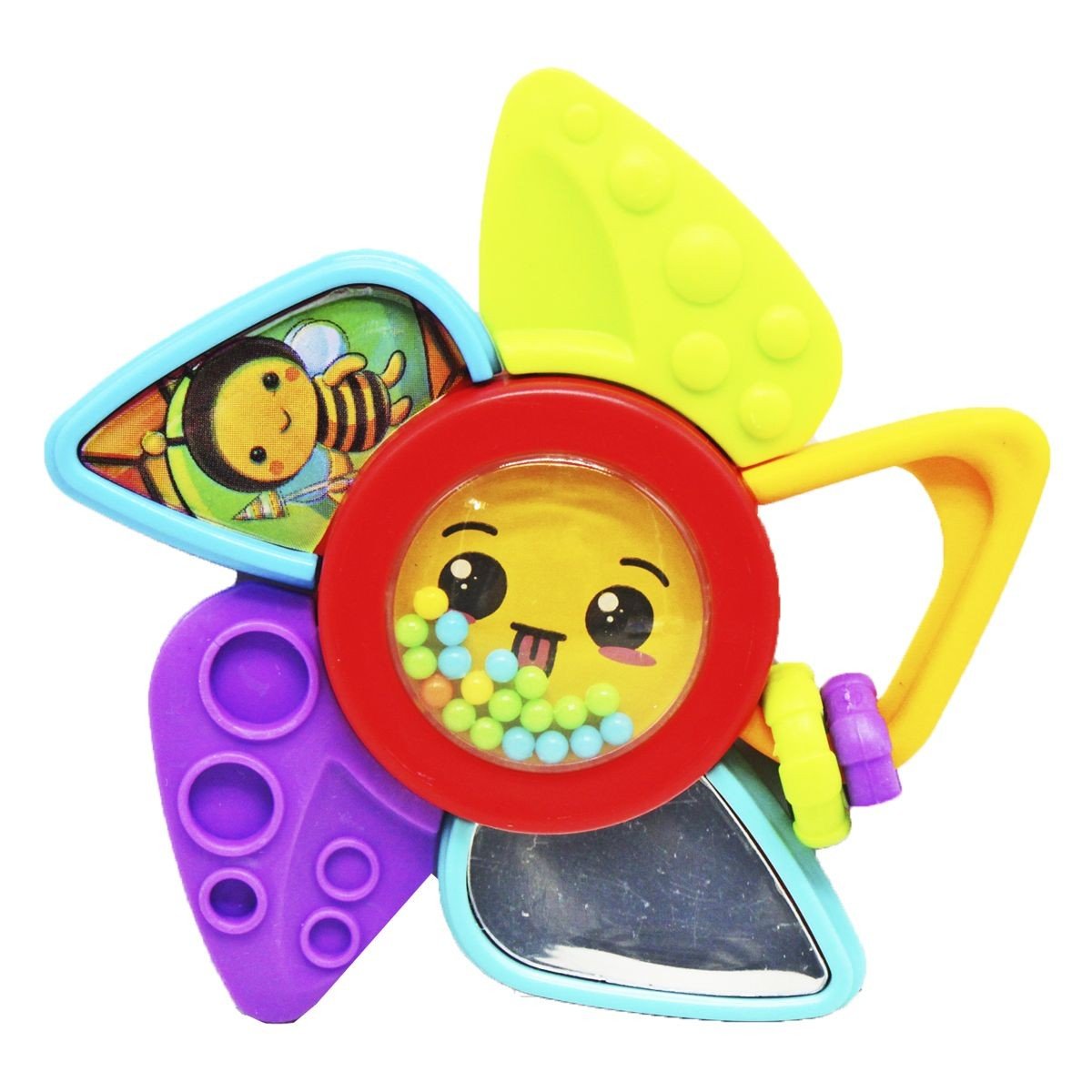 Яскраве брязкальце у вигляді квіточки, кожна пелюстка якої має свою функцію. Іграшка оснащена трьома пелюстками-прорізувачами, дзеркальцем та різнокольоровими гумовими кільцями. У серединці квіточки є прозоре віконце, через яке видно різнокольорові кульки, що гримлять. Розмір іграшки – 12х12 см.