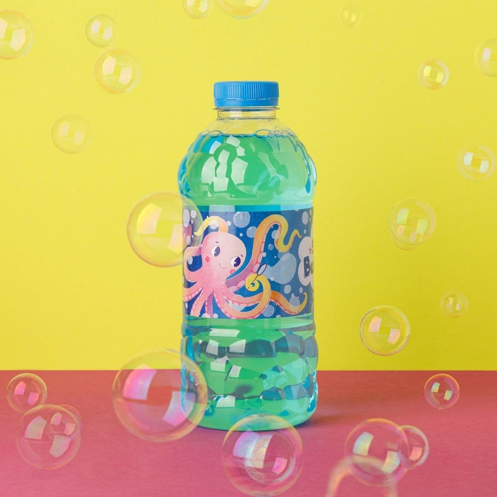 Мильні бульбашки (запаска). Пляшечка виконана в яскравій мультяшній стилістиці. У наборі немає рамки для пускання бульбашок. Гра з бульбашками розвиває в дитини фантазію, а ловлячи бульбашки ще й координацію рухів. Має приємний запах. Обʼєм пляшки - 1000 мл.