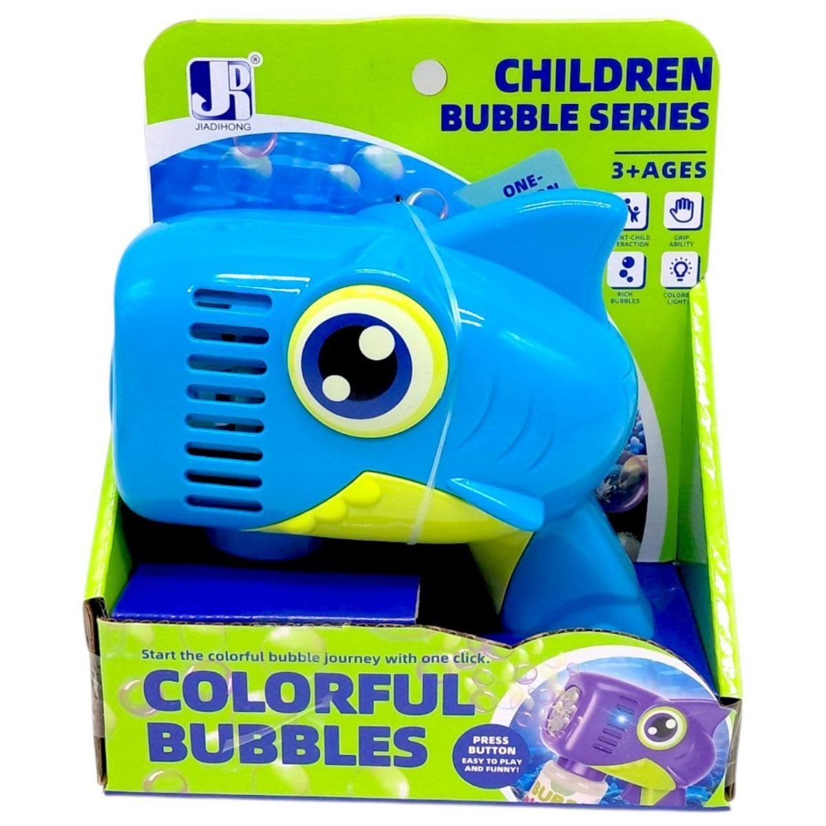 Яскравий бульбашкомет у формі кумедної акули створений для веселих ігор на свіжому повітрі та вдома. Іграшка швидко утворює багато мильних бульбашок, перетворюючи звичайну гру на справжнє святкове шоу. Завдяки зручній конструкції та простому керуванню дитина легко запускає бульбашки одним натисканням кнопки.
