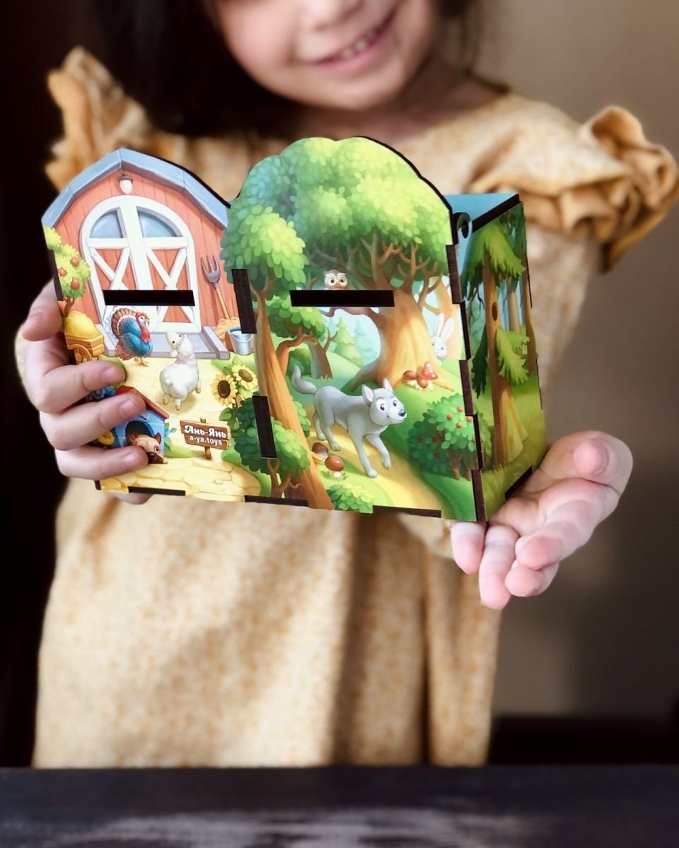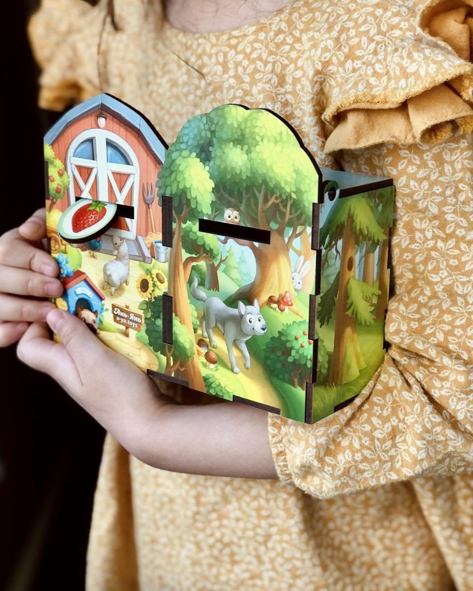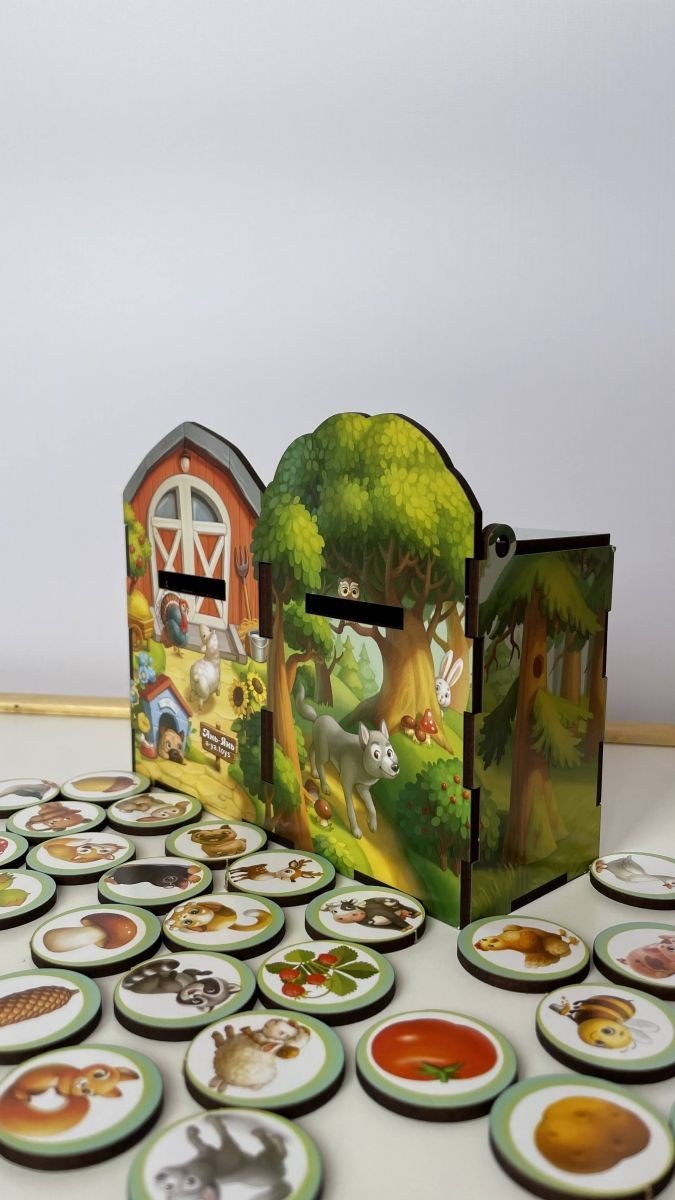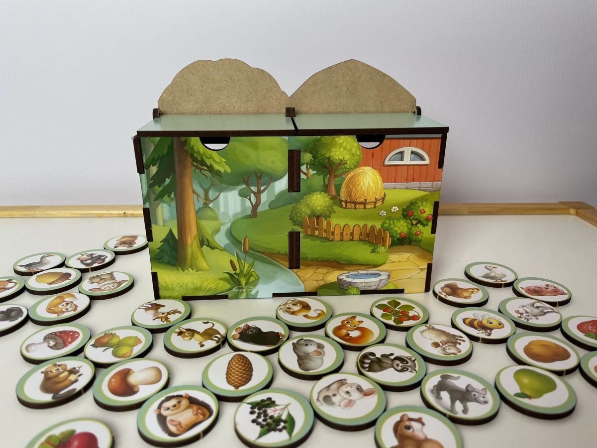 Чарівний ящик – сортер-комодик. У наборі: 40 плашок та яскравий комодик, розділений на 2 скарбнички, в які дитині потрібно правильно розсотувати звірів: дикі до лісу, а домашні на ферму. Окрім плашок зі звірами у наборі йдуть фрукти, овочі, ягоди та гриби, які дитині потрібно правильно розкласти - що де росте.