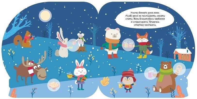 Чарівна книжечка за наліпками у вигляді кришталевої кулі. На її сторінках ви побачите, як люди і тварини радіють дивовижній порі року - зимі. Вони ліплять снігових баб, катаються на ковзанках і санчатах. А за допомогою наліпок малюк доповнюватиме малюнки та розвиватиме дрібну моторику, кмітливість, уяву, логіку і фантазію.