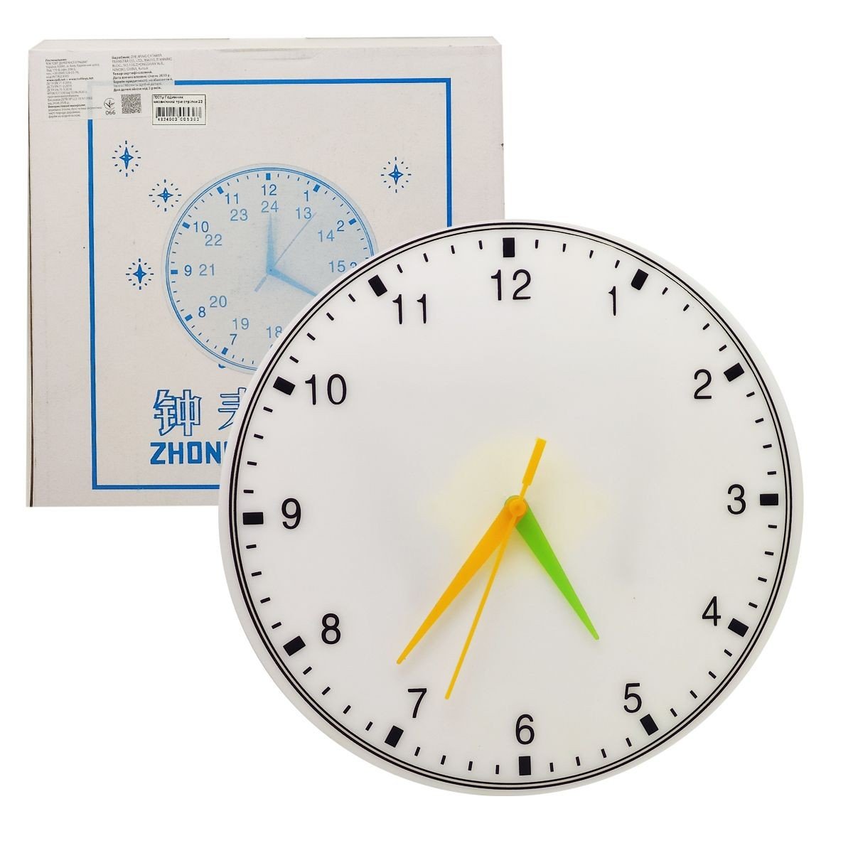 Заводний демонстраційний годинник. Призначені на навчання дітей дошкільного віку. На годиннику є 3 стрілки що вказують на: годинник, хвилини та секунди. За допомогою демонстраційних годин можна легко навчиться розуміти час по справжньому годині (демонстраційний годинник не ходить). Розмір 25х25 см.
