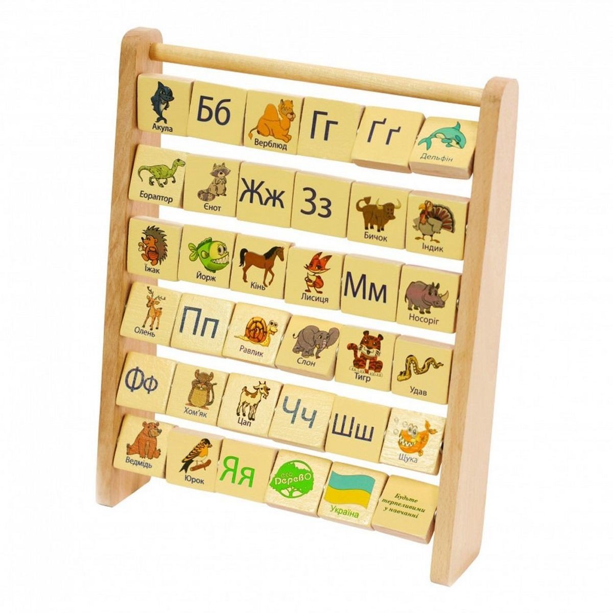 Дерев'яна абетка у вигляді стійки з шістьма рядами букв, що перевертаються. На звороті кожного квадратика з літерою є малюнок, що відповідає цій літері. Висота стійки - 28 см. Виконано з якісних та екологічних матеріалів.