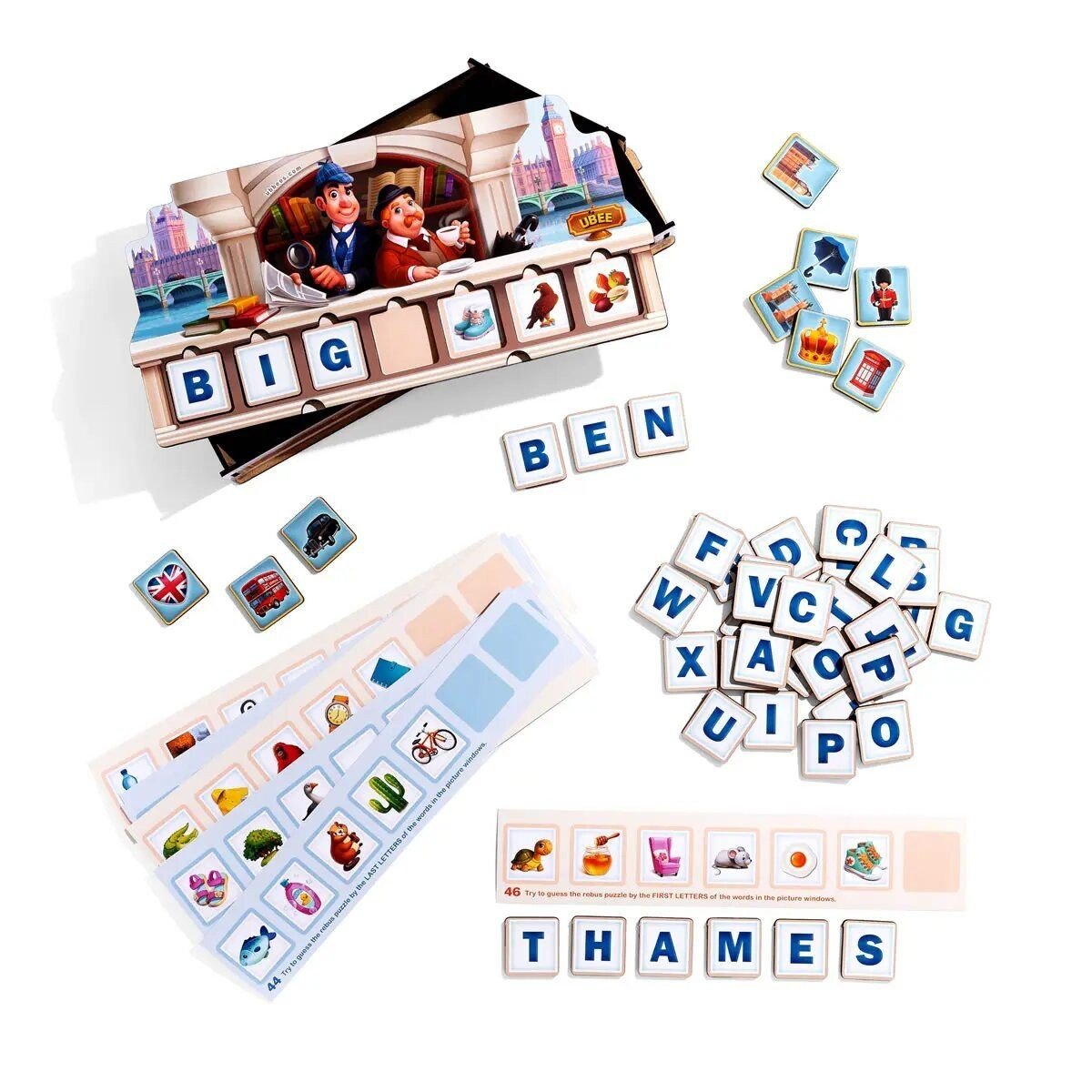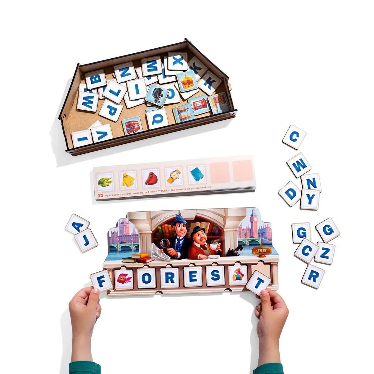 Комплектація: Дерев'яна коробочка, основа-планшет, 72 завдання, 42 літери, 9 нагород за вірно відгадане слово