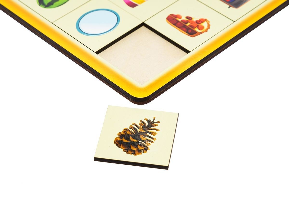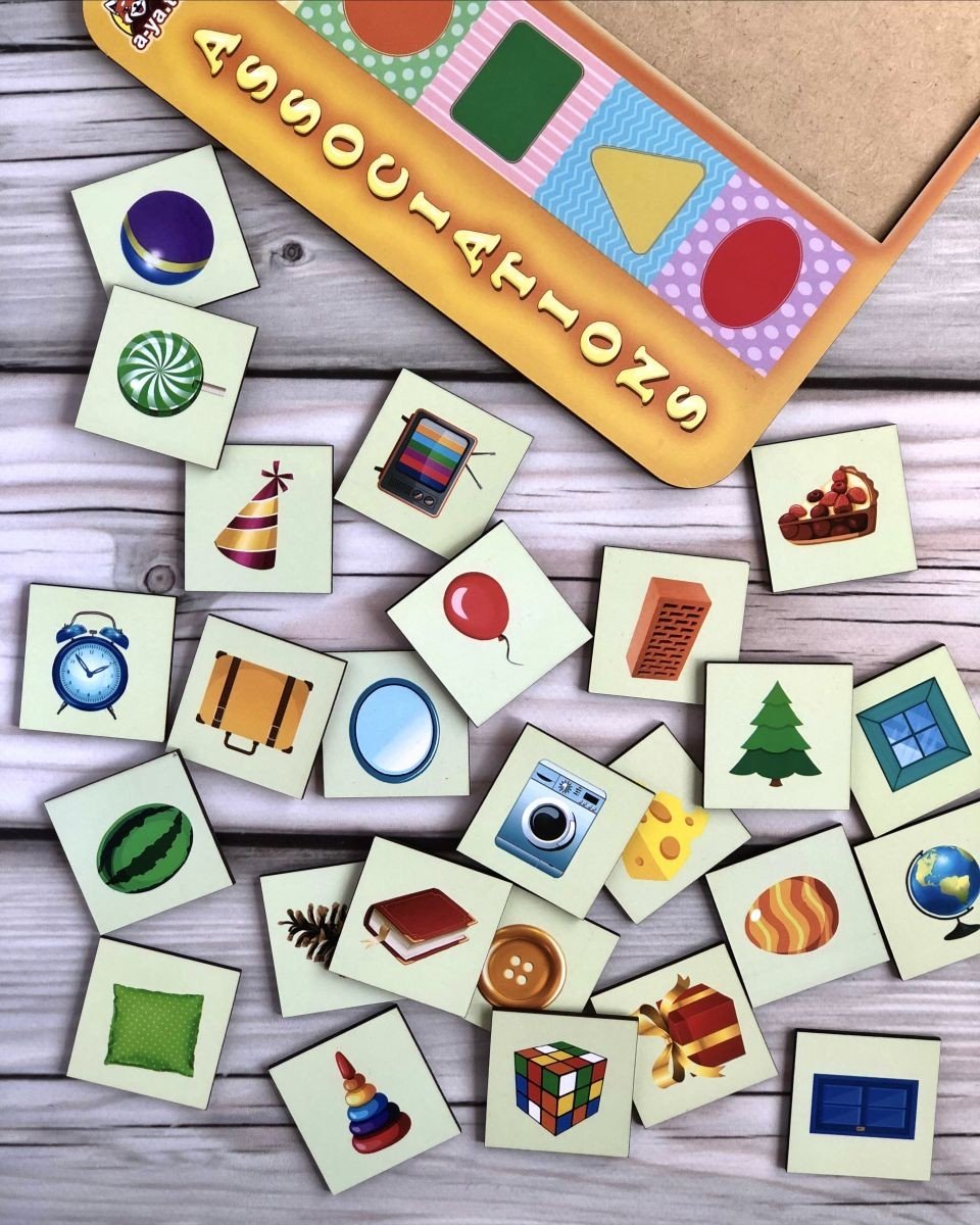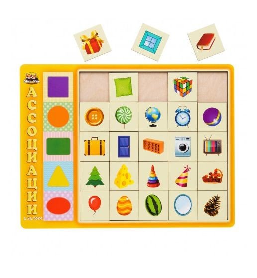 Дерев'яна гра "Асоціації". Складається з планшета і дерев'яних фішок. Потрібно вибудовувати асоціативний ряд. Відмінно тренує дрібну моторику, логіку, пам'ять, увагу, мислення. Розмір рамки - 32,5х23 см.