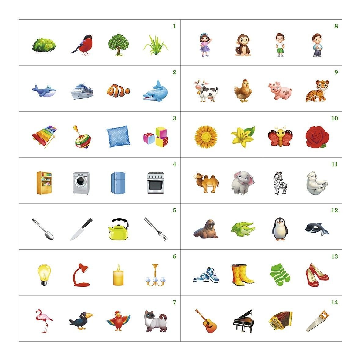 Наші панди далекобійники перевозять різні вантажі: побутову техніку, меблі, тварин, одяг, інструменти та інше. 1-й варіант гри: допоможіть пандам знайти 4-го зайвого на кожному завданні. Наприклад: серед домашніх тварин знайти дику, або серед овочів - фрукт. Проговорюйте з дитиною назви кожного предмету. Що об'єднує інші предмети? Як їх можна називати одним словом?