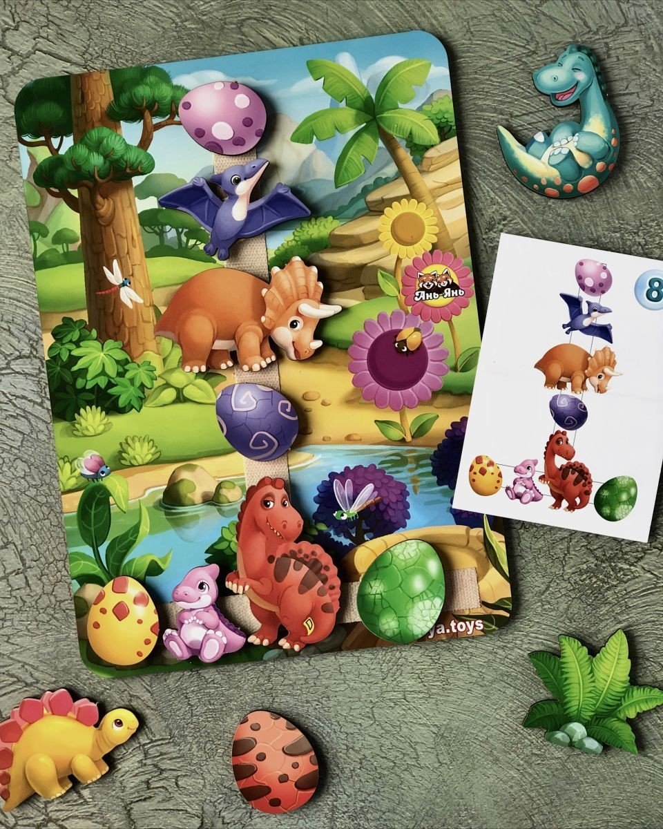 Гра складається з тематичного планшету-фону з липучкою (горизонтальною і вертикальною - вчимо напрямки) і 18 різних елементів на липучках. У наборі також йдуть картки з візуальними завданнями різного рівня складності: повторити по картинці, по контуру, за силуетом. Дитині потрібно розташувати динозавриків, яйця і і кущики так, як це показано на картці-схемі. Поговоріть з дитиною про те, хто з динозаврів травоїдний, а хто хижак.