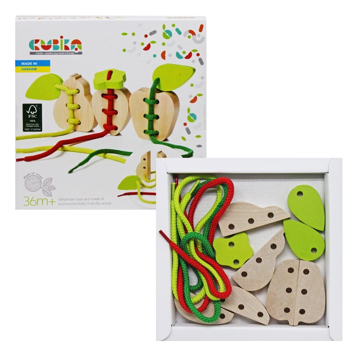 Розвиваюча іграшка із натурального дерева. Дитині належить правильно звязати шнурочком деревяні половинки фруктів. Шнурівки розвивають дрібну моторику рук, формують навички шнурування та завязування шнурка в бант, просторове орієнтування, сенсомоторну координацію.