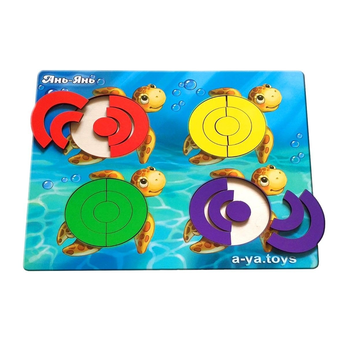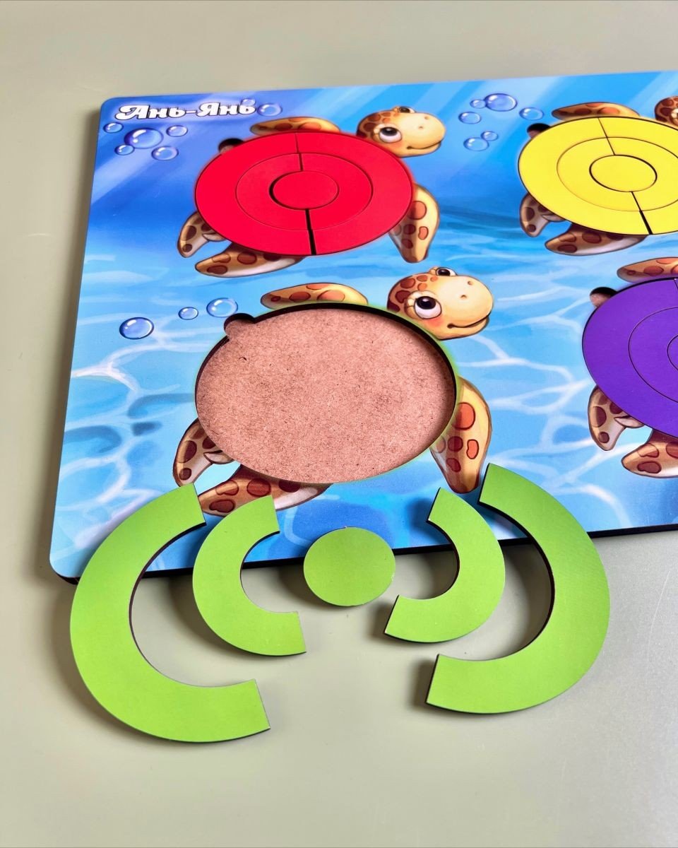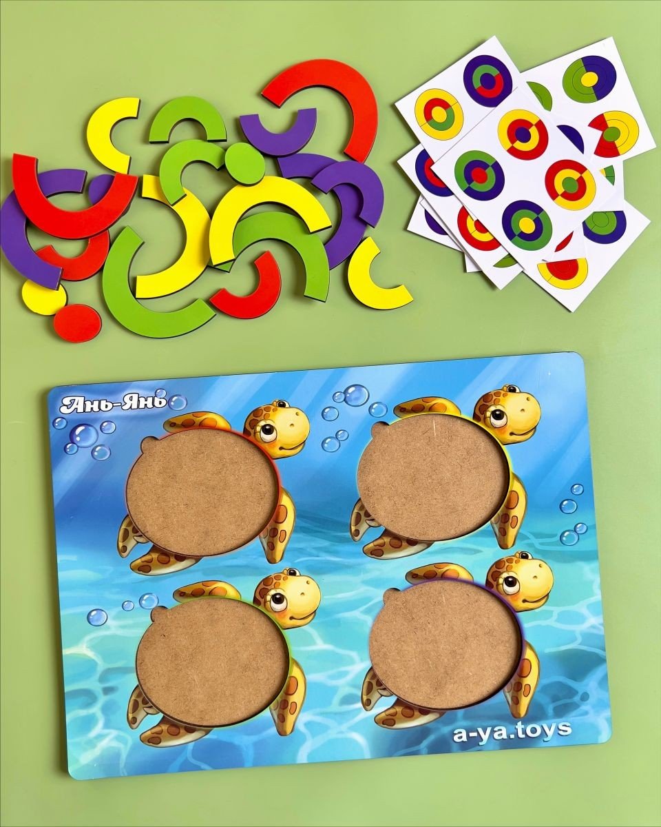 Розвиваюча гра у вигляді черепашок з різнобарвними панцирами. У комплекті є картки із візуальними завданнями. Потрібно підібрати кольори панцира для черепашки як зазначено в завданні або самим придумати поєднання кольорів. Гра - чудовий помічник у вивченні фігур, рахунки та кольорів.