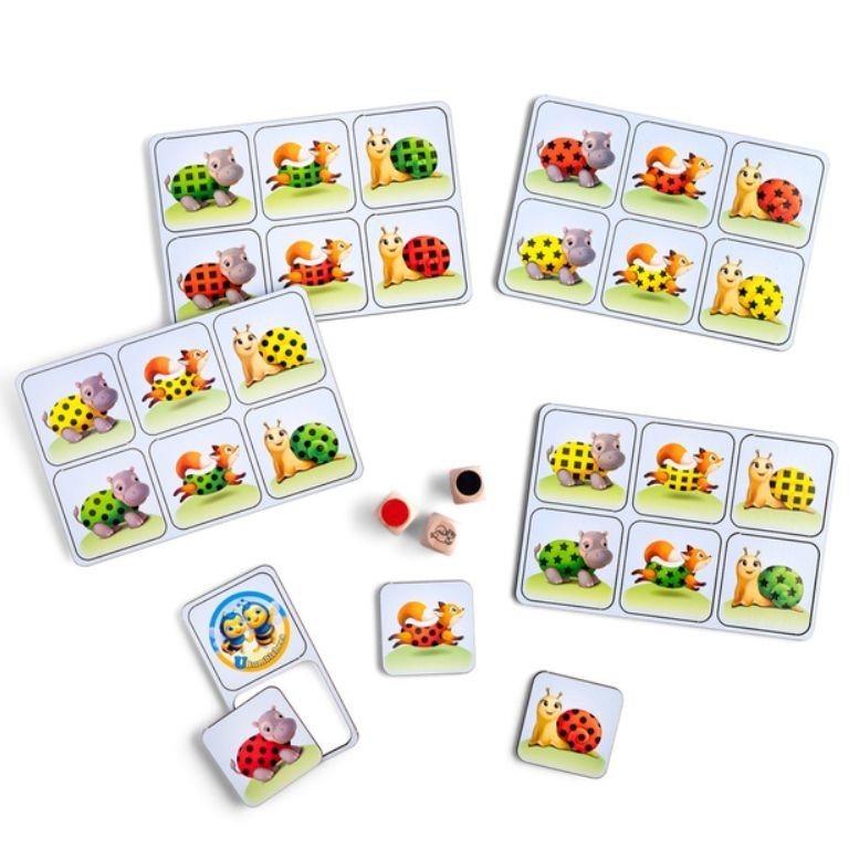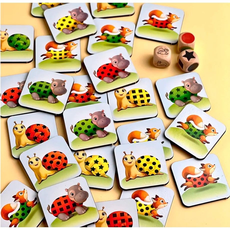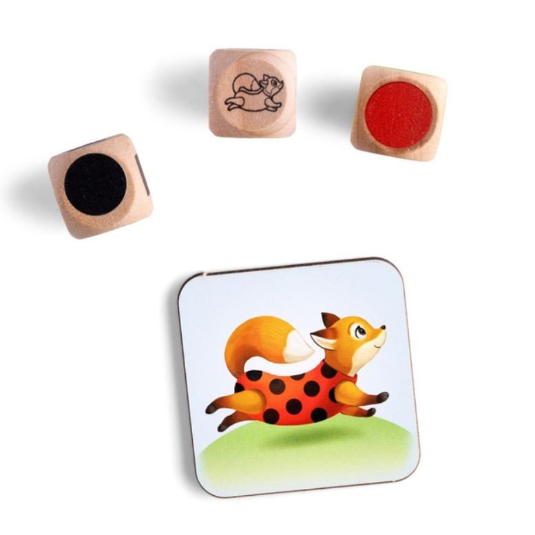 Завдання дитини: першим зрозуміти, хто саме випав на кубиках і знайти цю фішку. На кожному з кубиків є відповідно тварина, фігура і колір, а дитина повинна якнайшвидше знайти картку, яка відповідає всім характеристикам. У комплекті: 27 фішок, 3 кубики.
