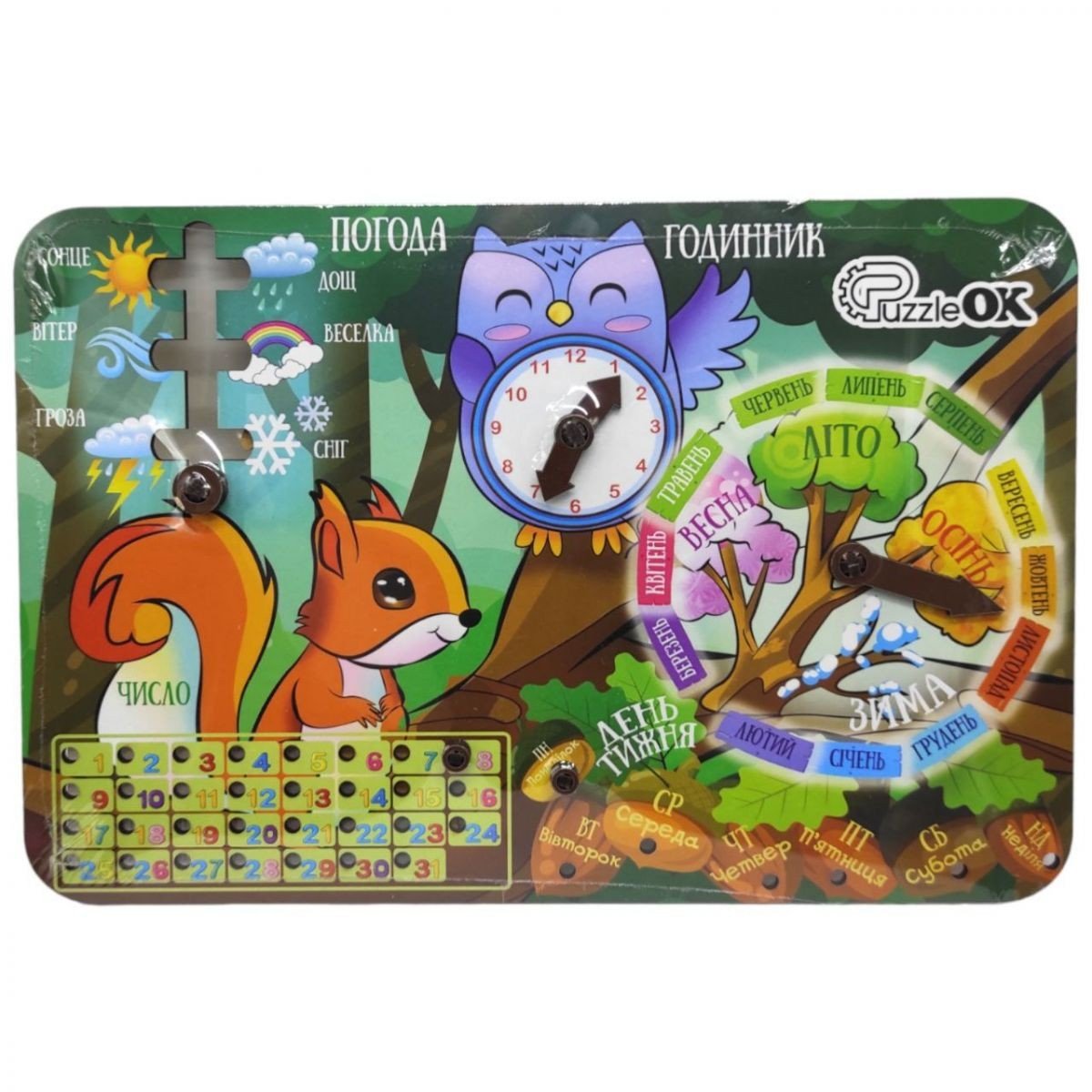 Деревʼяний каледарик з безліччю інтерактивних елементів, які допоможуть дитині вивчити пори року, погоду, дні тижня та числа, а також навчить користуватися аналоговим годинником. Іграшка виконана з екологічних та безпечних для дитини матеріалів. У комплекті є зручна підставка для календаря. Розмір: 29 х 19.5 см.