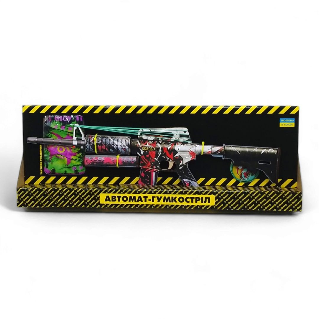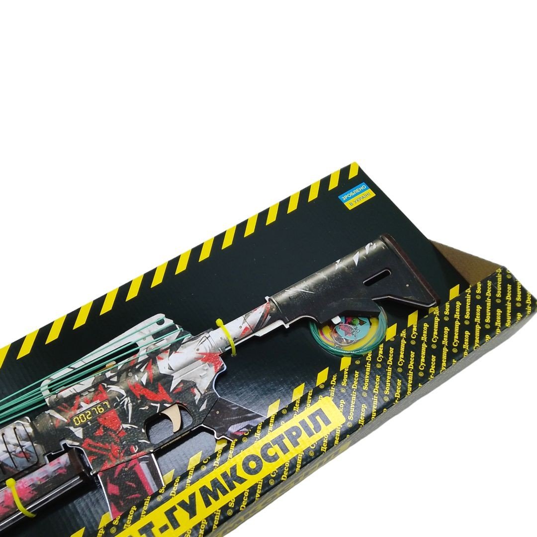 Деревʼяний автомат, який стріляє резинками, з глушником. Розмір зброї - 58 см.
