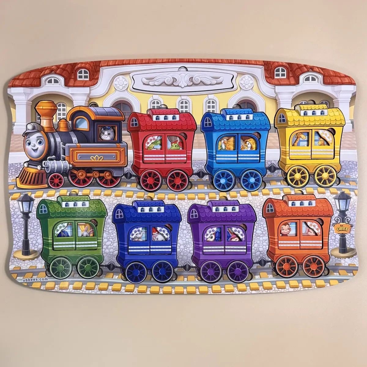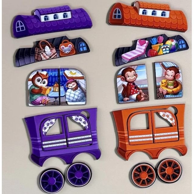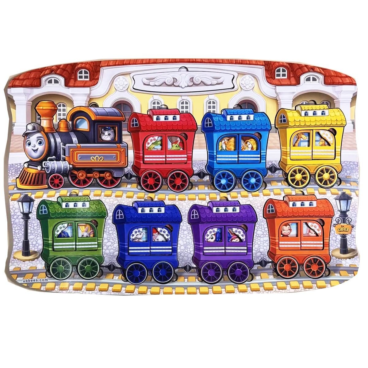 Великий деревʼяний пазл-вкладиш - чудовий варіант подарунку для діток від 2 років. У наборі 81 деталь, 7 вагонів і локомотив. Деталі взаємозамінні. Розмір: 47,5 х 32,5 см. Вагони різних кольорів: блакитний, червоний, жовтий, зелений, синій, помаранчевий, фіолетовий. Пасажири Мега потяга: совушки; зайчики; мавпочки; слоненятка; жирафи; крокодили; гуси та котик-машиніст. Кожен вагон індивідуальний по дизайну, виймаються звірі і багаж, двері у вагонах праві і ліві,колеса різного розміру.